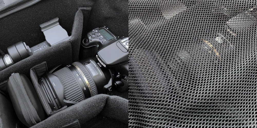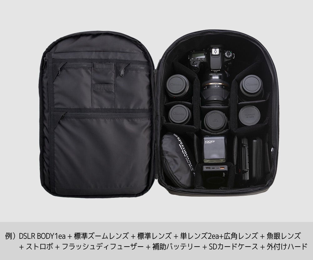 重いカメラや装備を収納するカメラバッグ!少しでも肩を軽くできるよう工夫して開発しました。最大限の重量で、すべての機能を入れた超軽量のカメラバッグです。