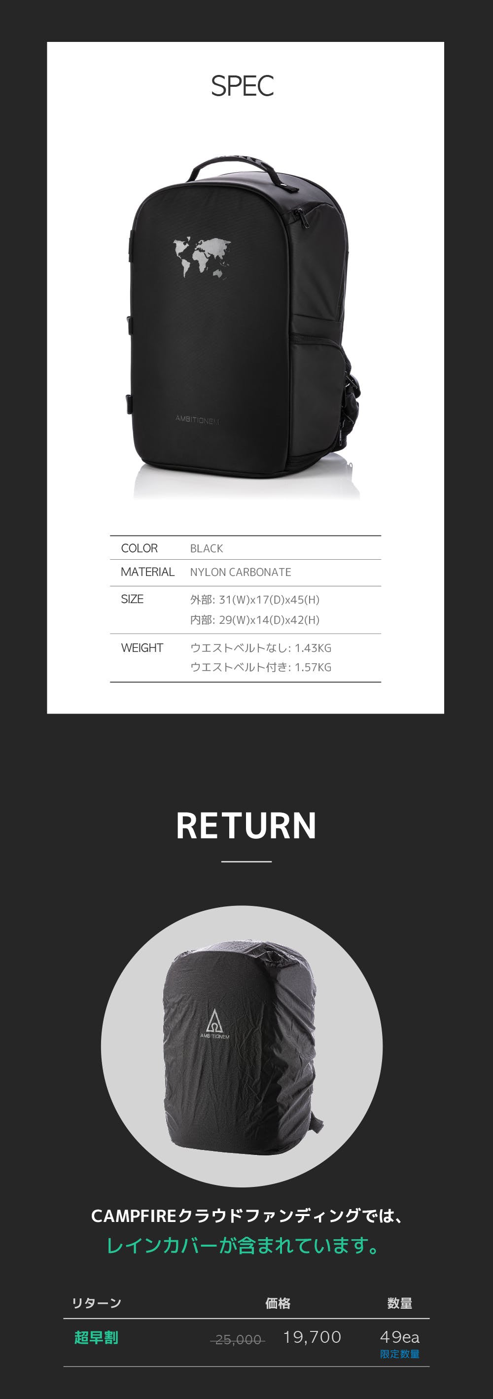 5)予期せぬにわか雨が降りても優れた撥水力でバックが雨に濡れないようしっかり守ってくれます!今回のファンディングではモーメントバックとともに含まれており経済的です!。