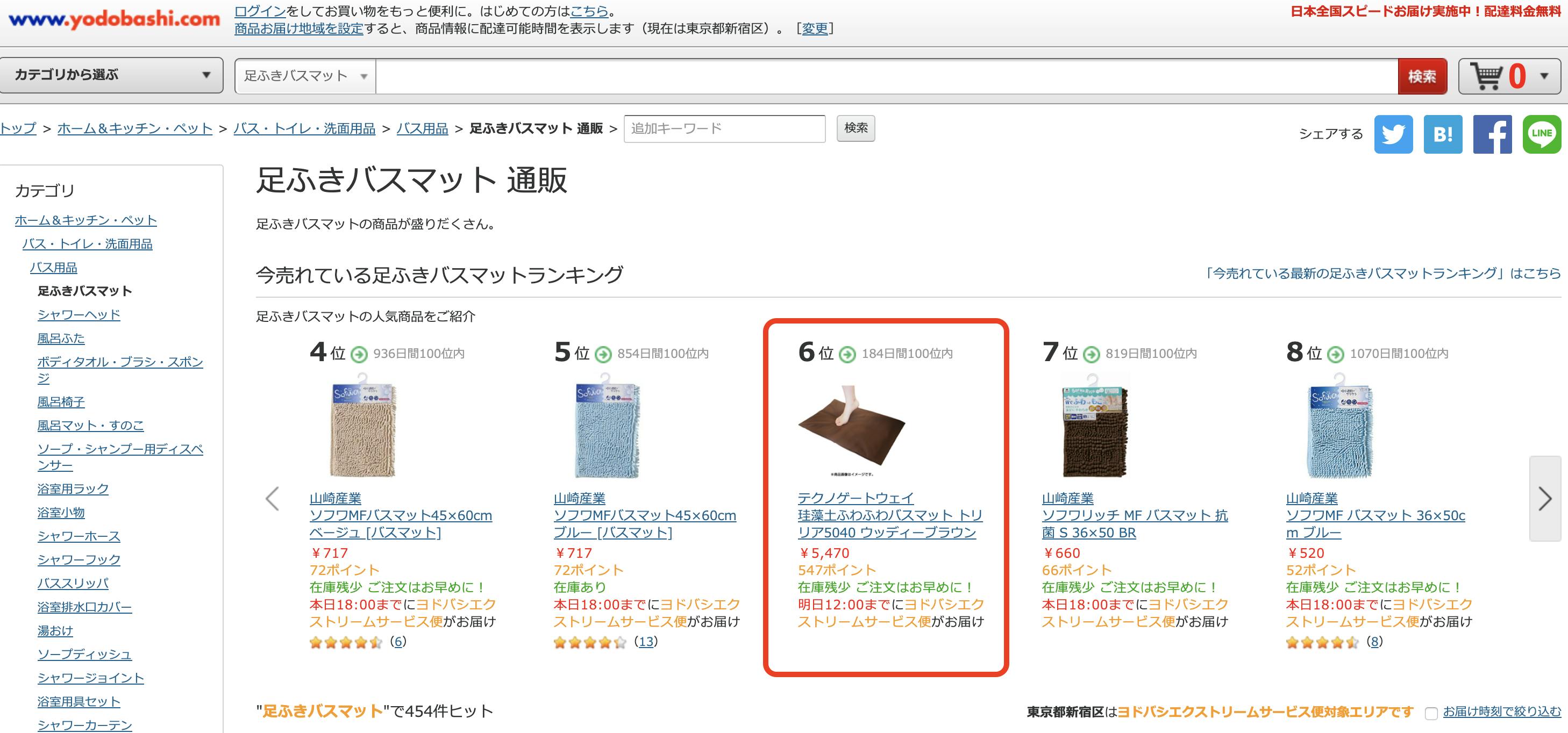 最近柔らか珪藻土バスマットがヨドバシカメラ様のご発注頻度が高く、サイトを確認したところ456件中、堂々6位にランクイン!