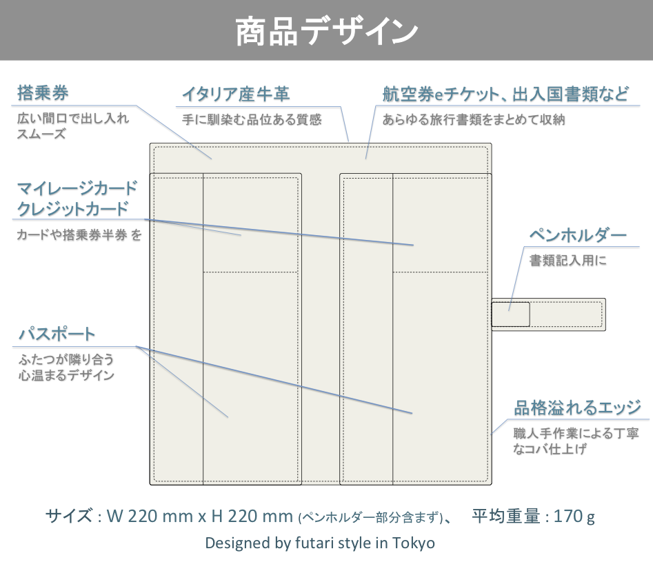 このたび提案する二人用パスポートホルダー「futari passport」(読み方:フタリパスポート)は、単なるパスポートの入れ物ではなく、パートナーと一緒に人生の旅を歩もうという、心に訴えかけるメッセージが込められたアイテムです。愛する伴侶と歩む生涯は、長いようでとても短く、その一瞬一瞬を幸せに大切に過ごしたいもの。そんなふたりに素敵な体験と思い出を、という想いから生まれたfutari passport。