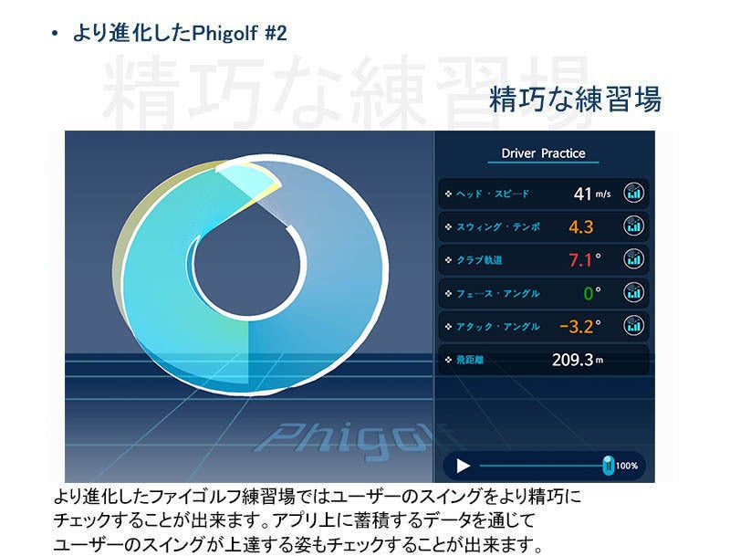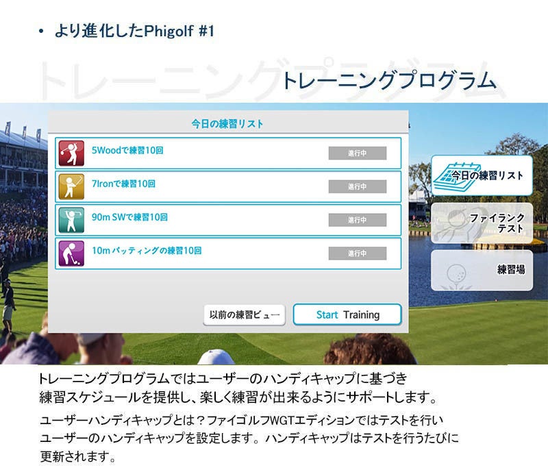 A:ゴルフ入門者や初心者のゴルフユーザーに最適化された製品です。ファイゴルフでトレーニングすれば簡単に楽しくスイングの向上を目指せます。