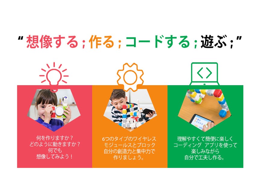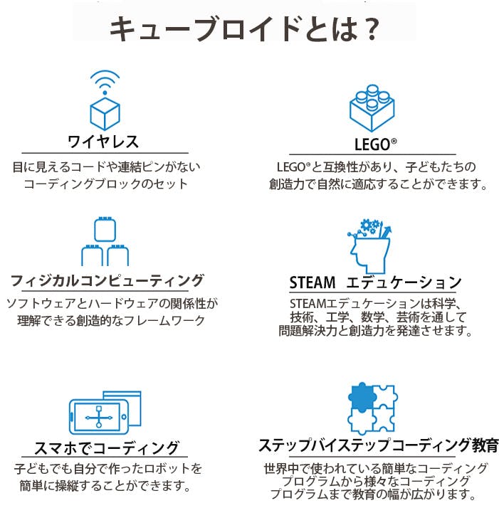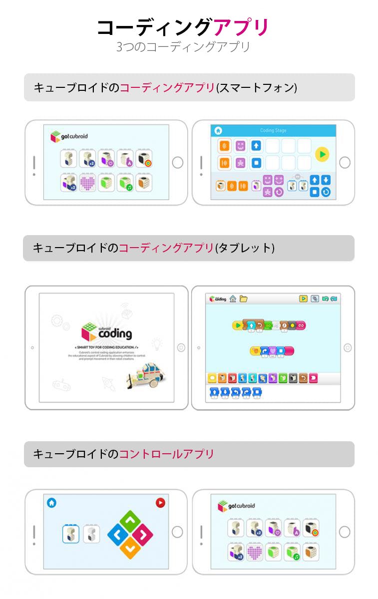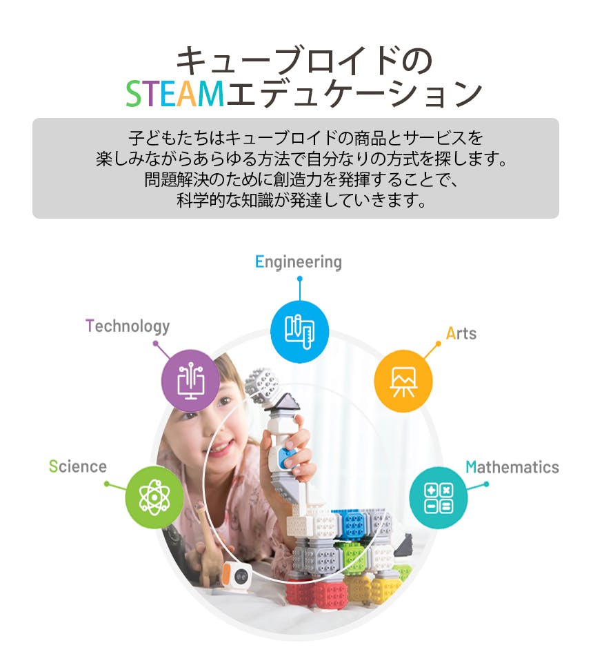 また子どもたちはプログラミングを使いながらロジカルシンキング(論理的思考)を広げることができ、よりクリエイティブな思考が可能になります。キューブロイドはおもちゃで遊ぶ時と同じく、遊びながら自然にコーディングする面白さを探すことができます。また、キューブロイドはプログラミングというフラットフォームの中でコーディングを楽しく学べるように革新的な商品とサービスを提供していきます。
