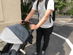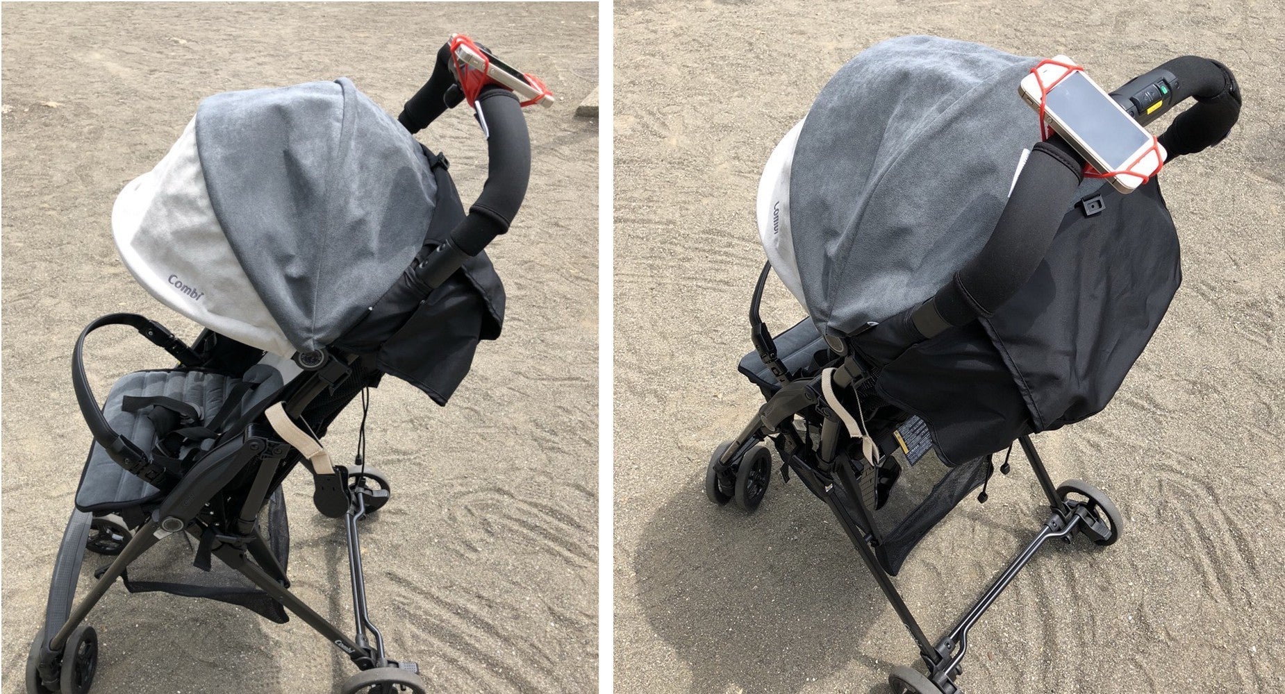 携帯をハンドルに固定して、両手でベビーカーを押すことができます!