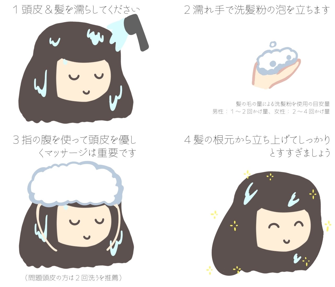 髪の毛は優しく洗ってください。