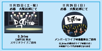 リターンの一つのスタジオライブと、ライブ映像鑑賞会の日程が決まりましたのでご報告させて頂きます!●D_Driveスタジオライブご招待 11月23日(土・祝)お昼 大阪近郊にて●メンバーとライブ映像鑑賞会ご招待 11月24日(日)お昼 大阪近郊にて(ドリンク代が別途かかります)パトロンの皆様、この日は楽しみましょう!なお、【D_Driveの機材車でメンバーと大阪を巡るドライブ!】のリターン日程については、新しい機材車で行いたいと考えております。段取りがつき次第、こちらからいくつか候補日を出し、極力パトロン様に合わせて調整したいと思っておりますので、こちらの方も引き続きよろしくお願い致します。【企業様限定】コースに関して『個人でイベントを計画されてD_Driveに出演依頼しよう!』という考えでこのコースをご利用頂いても構いません。制作イベンター様として承りますので問題ありません。
