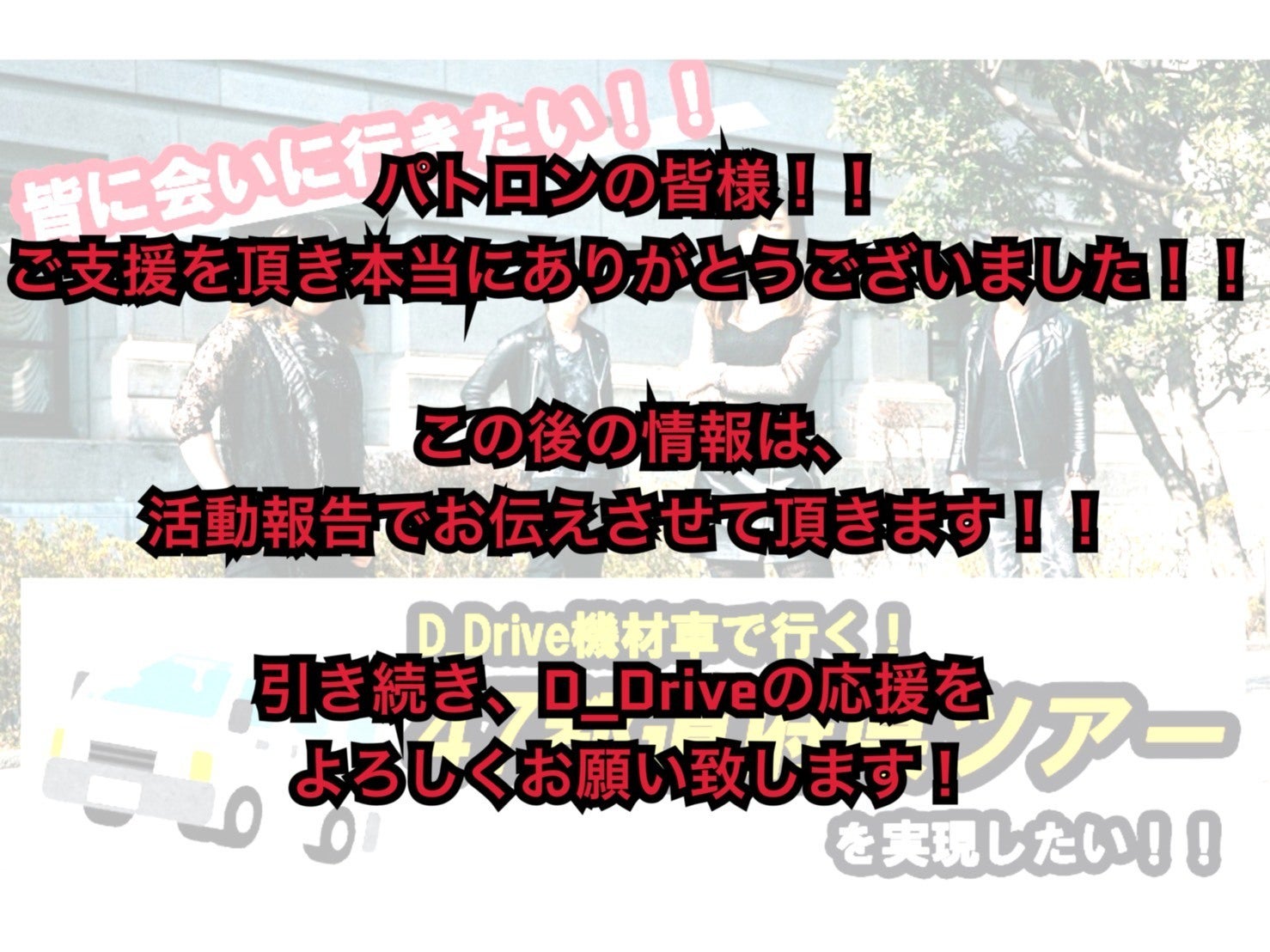 《皆に会いに行きたい!D_Drive機材車で行く47都道府県ツアーを実現したい!》先程終了致しました!400人というたくさんの支援者様・パトロン様にご協力頂き、おかげさまで目標金額を大きく上回って終了する事が出来ました!!パトロンの皆様、心から感謝申し上げます!本当に本当にありがとうございました!!この後の活動は、活動報告や各SNSなどで発信して行きたいと思いますので、引き続き応援よろしくお願い致します。11月10日(日)神奈川・厚木サンダースネイクより、47都道府県ツアーが始まります!我々D_Driveがあなたの都道府県へライブをしに行く時は、是非ライブ会場まで足を運んで頂けると幸いです!http://www.ddrive-official.com/《限定本に記載させて頂くお名前について》限定本に記載させて頂くパトロン様のお名前ですが、ご支援して頂く際に備考欄に記載するお名前を記入して頂くようになっていたのですが、無記入の方やお名前が無くメッセージを書かれていた方が多くおられます。もう一度確認をさせて頂きますので、今一度ご確認をお願い致します。