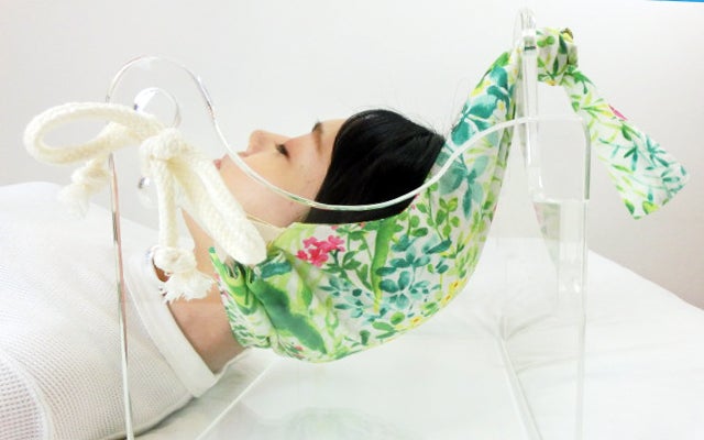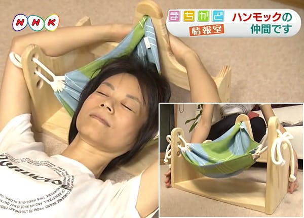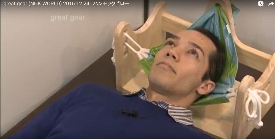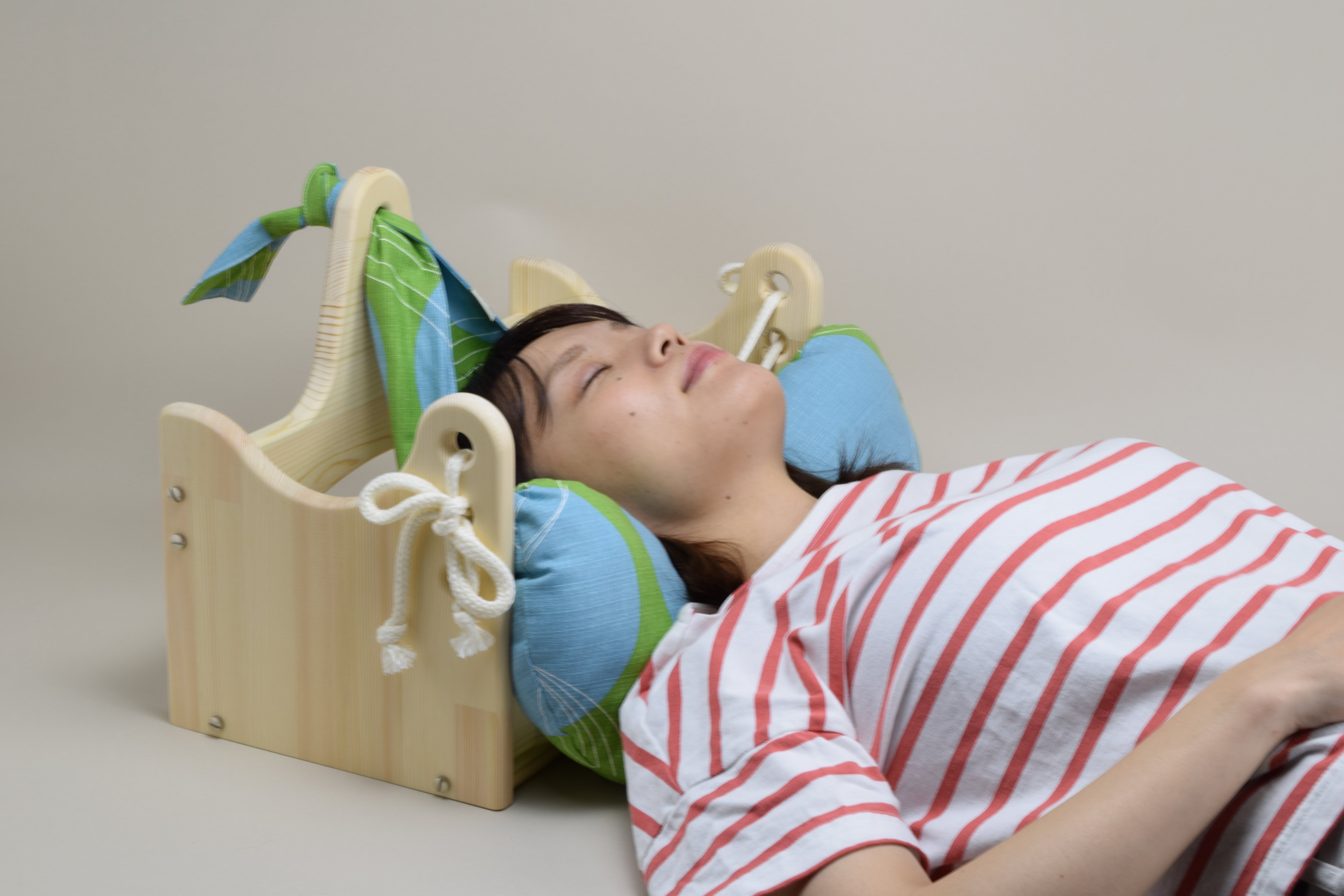 首に悩みを持つ日本人女性が開発しました。日本の家具職人が手作業で作った木製フレームに、頭の形に添って立体的に包み込む特殊な布を、3か所から吊り下げた枕のイノベーションです。