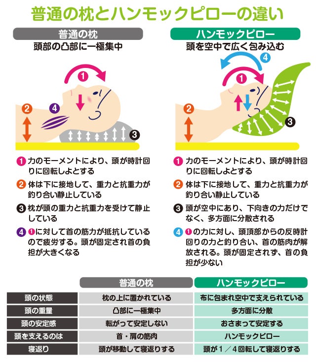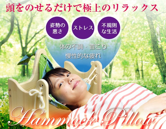 頭の重さを空中で分散し、首が無重力状態になるハンモックピローは、今までの枕とは全く異なる画期的なアイテムです。1台で「就寝」と「整体」に使える優れものです。