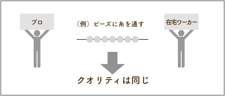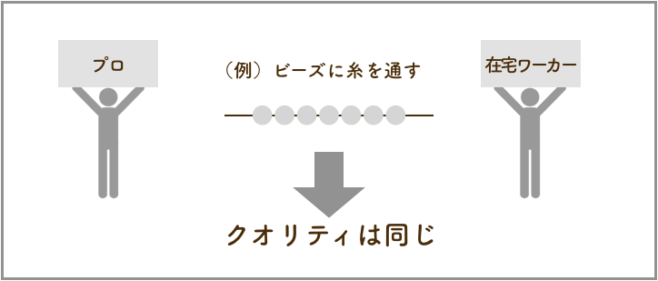 誰が作業しても仕上がりに差が出ない部分の作業工程のみを外注しています。例えば「ビーズに糸を通す」というようなことです。仕上げは私たちプロが専門の技術で手がけますので、製品クオリティにはまったく影響しません。
