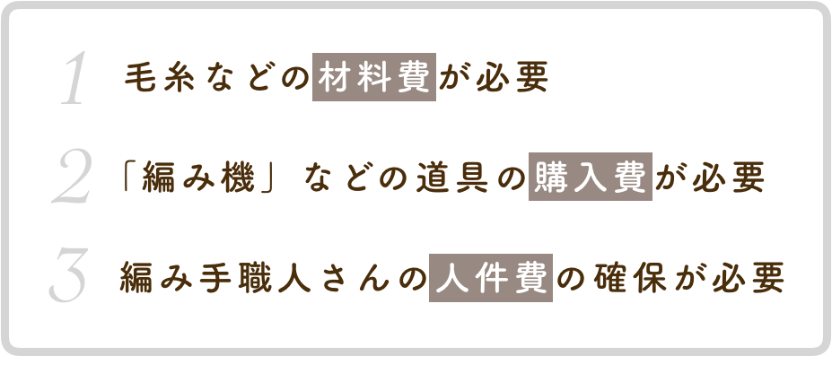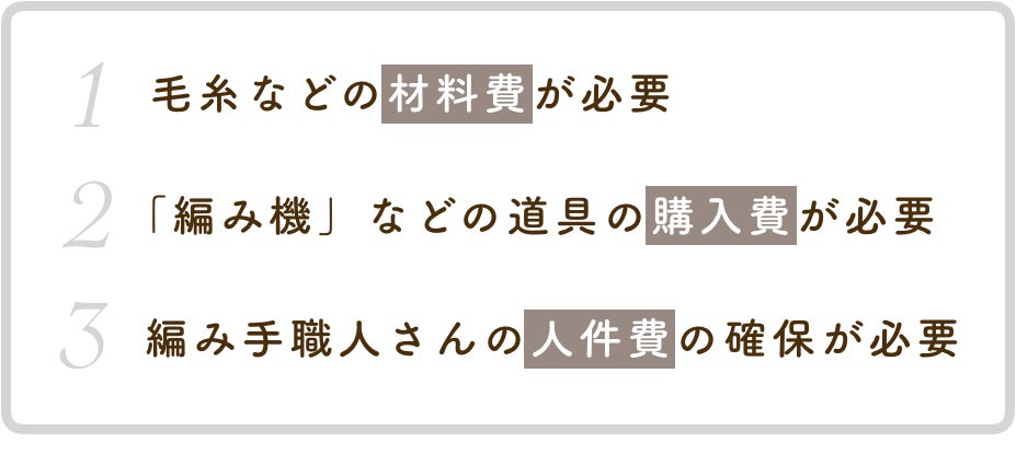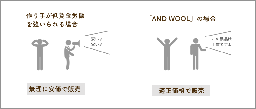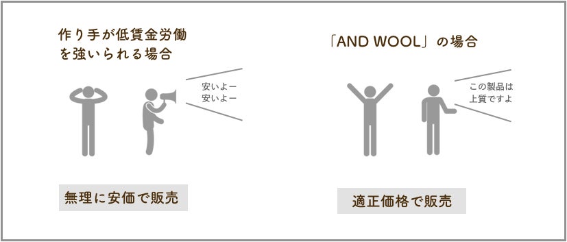 「AND WOOL」の製品は1つ1つ手作業で仕上げますから大変手間がかかりますが、上質で高級な製品に仕上がります。無理に安価で販売することなく適正な価格設定を行えば、製造現場の作り手に低賃金労働を強いる必要がなくなります。