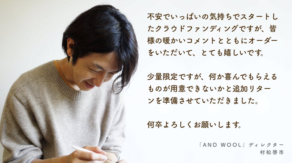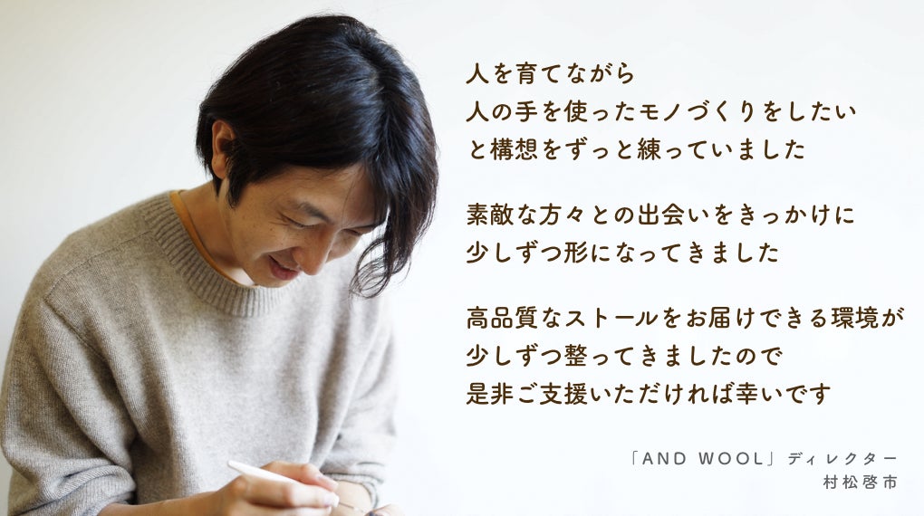 2019/11/21 12:15「チーム村松の会議室」では、ファッションデザイナー村松啓市とその挑戦を支えるチーム村松の定例会の内容を、毎回公開しています。先日より、この夏に挑戦したクラウドファンディングのその後の「チーム村松」の活動を、「After Story」としてこちらのページでご紹介させていただいております。今回は、クラウドファンディングで予約販売を行なった「魔法のストール」の一般販売がいよいよ開始になりますので、その詳細につきましてお知らせ致します。●一般販売につきましてこの度「魔法のストール」を含む、私たち「AND WOOL」の製品を、ファッション通販サイトの「ONWARD CROSSET/オンワードクローゼット」さんで販売させていただけることになりました。多くの有名ブランドと並んで、私たちの「手仕事で作った」製品が並ぶことになりました。今まで以上に多くの方たちに、私たちの製品の良さを知っていただければと思っております。▼販売開始日時11月21日(木) 11:00〜▼販売サイトONWARD CROSSETAND WOOL【公式通販】※こちらからお入りください。▼オープンキャンペーンAND WOOL 全商品10%OFF▼オープンキャンペーン期間11月21日(木) 11:00〜12月8日(日)23:59●主な販売商品のご案内▼ストール ¥17,600〜▼スヌード ¥12,100▼アームウォーマー ¥11,000▼ニット帽 ¥12,100●村松啓市よりごあいさつこのストールの制作が始まって、ついにたくさんの方の目に触れる機会が多い売り場にて販売させていただくことになりました。皆様が応援してくださるおかげです! 商品の良さが伝わるように頑張ります!! もっと見る