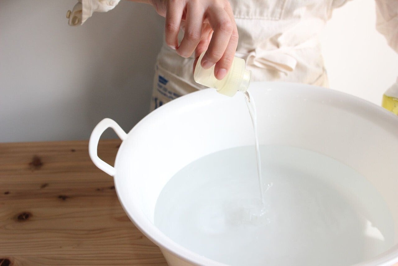 洗濯用桶に、水またはぬるま湯(30度以下)を4リットルとエマール10mlを入れて軽く混ぜます。