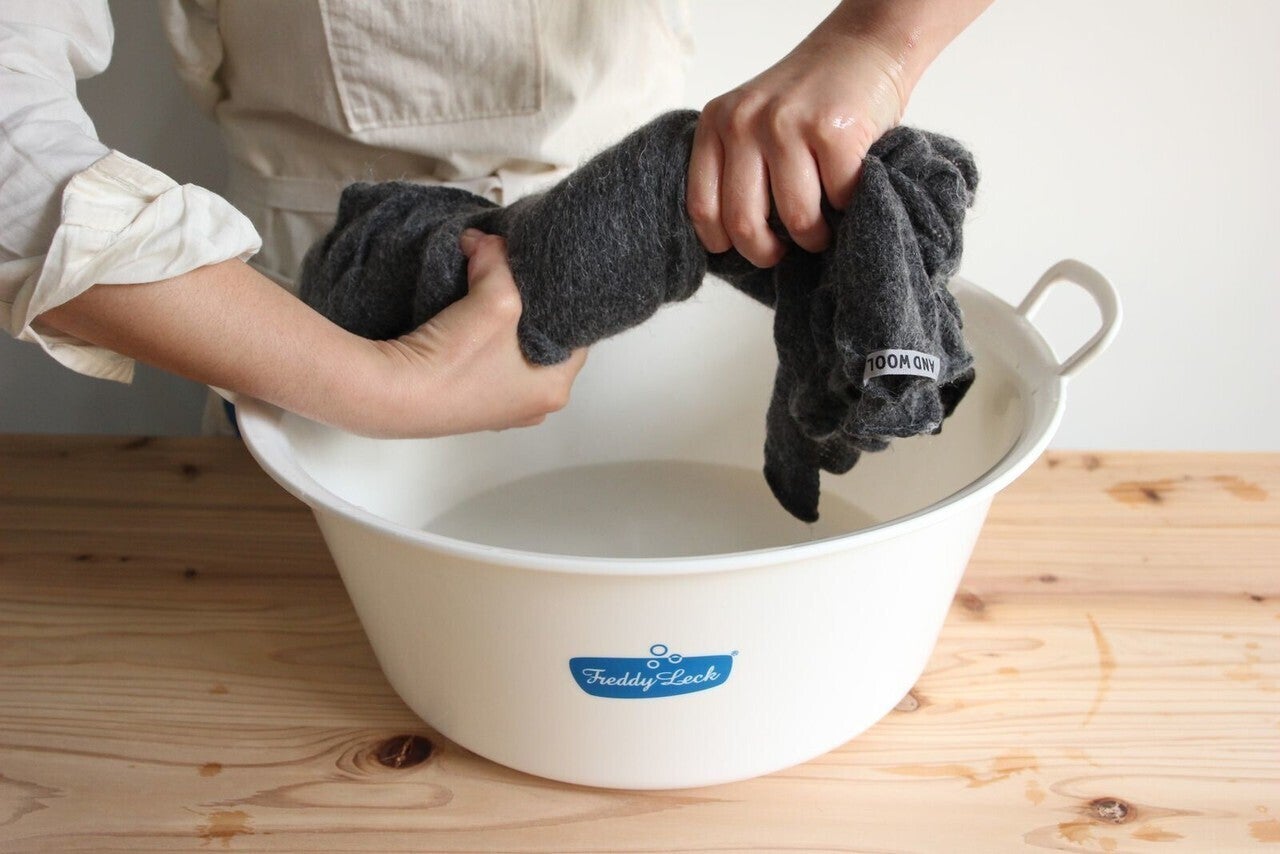 ストールを裏側(ネームタグが付いている側)にして、洗濯用桶の中に入れます。