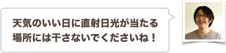 日陰で干してください。天気のいい日に直射日光の当たる場所などに干さないように注意してください。