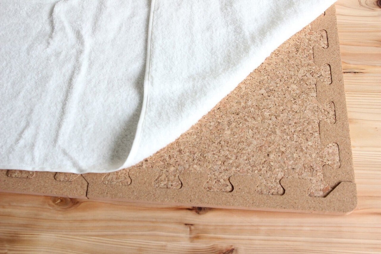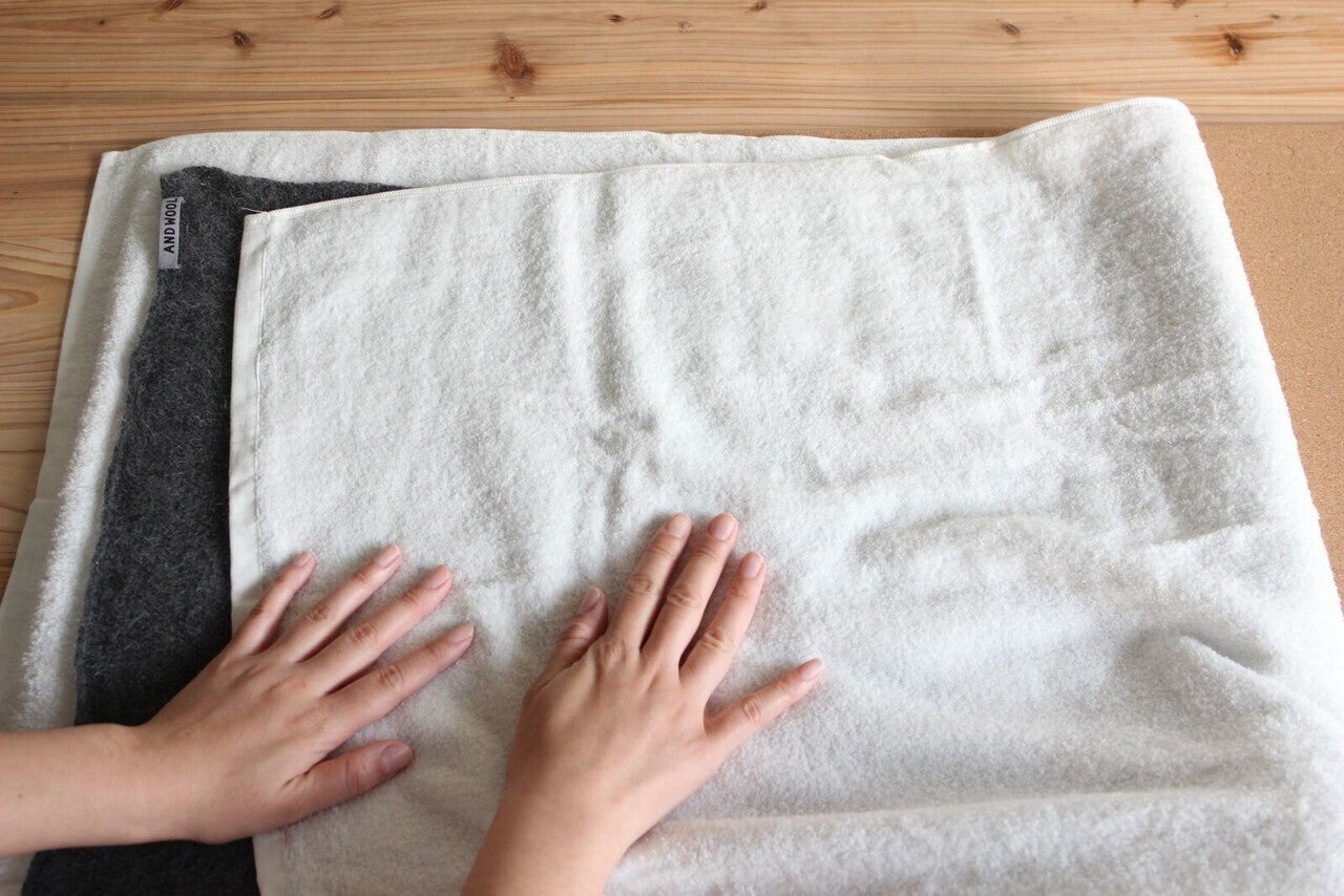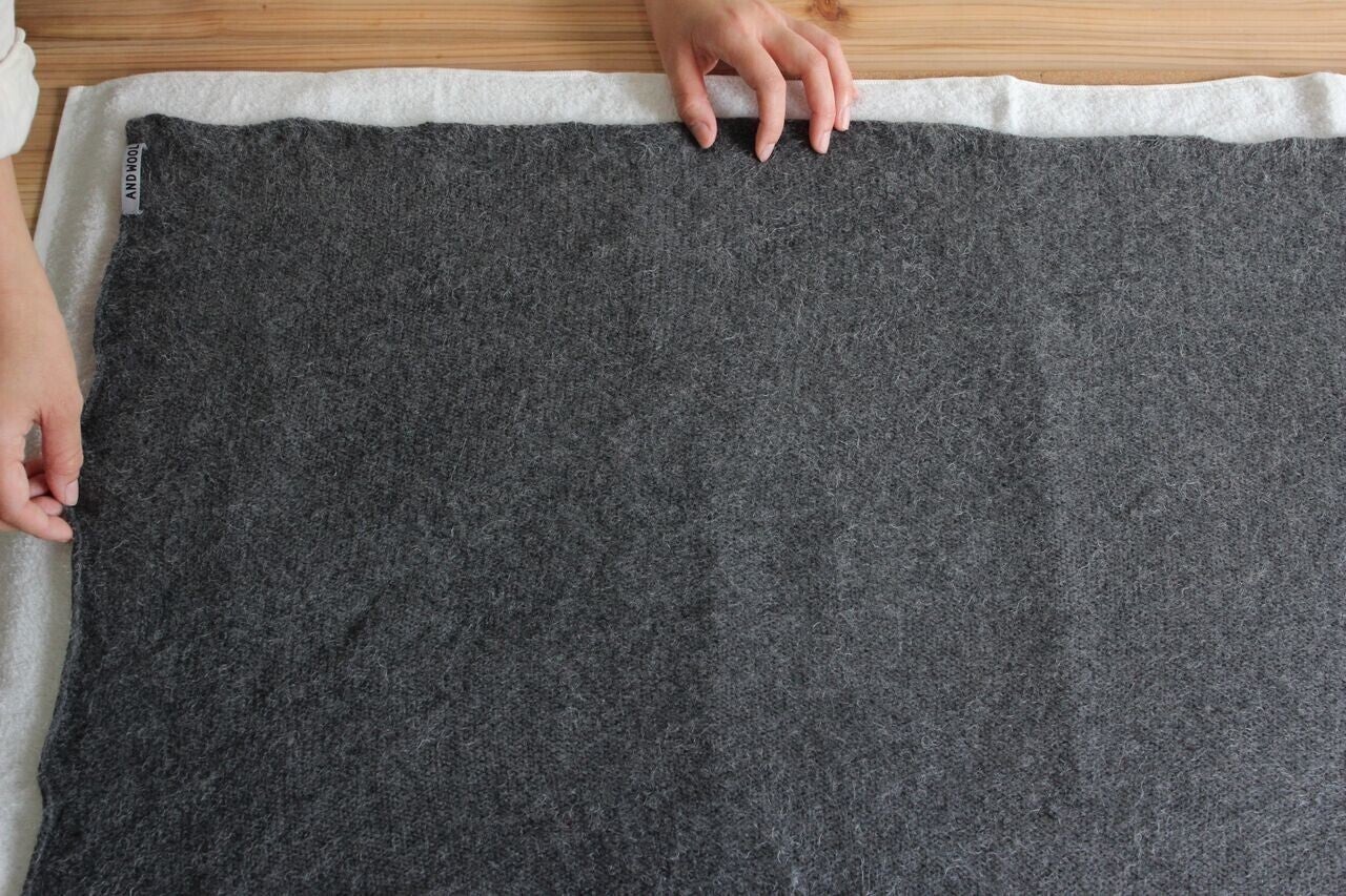 平置き干し用ネットの使用をおすすめしますが、ない場合はクッションフロアーマットの上にタオルを敷き、その上にストールを干してください。