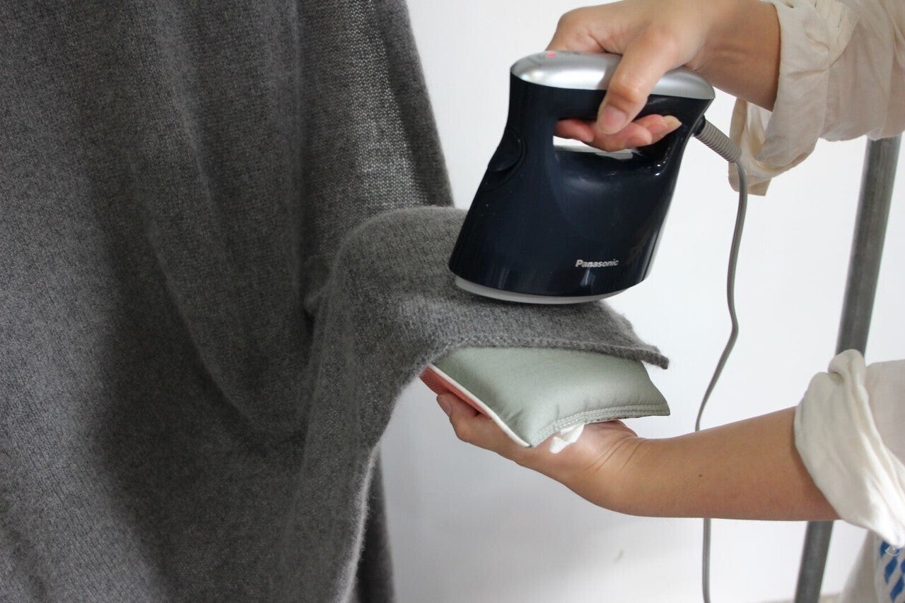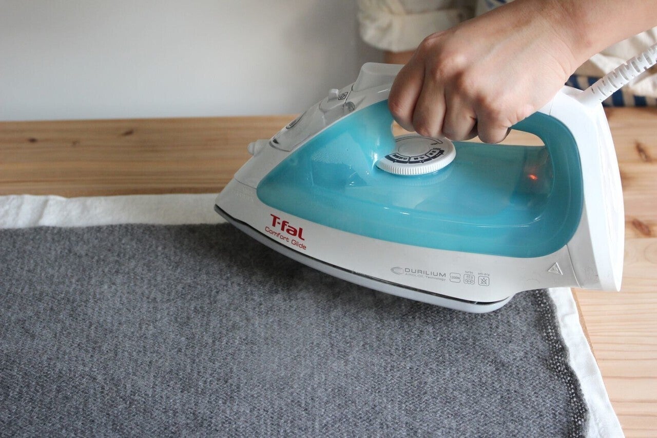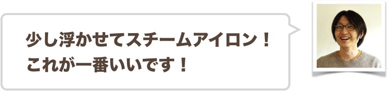 アイロンは中温(160℃程度)スチームが出るように設定し、1cm程度浮かせてかけてください。熱が冷めていくときに形がセットされるので、ストールが冷めてからまち針を外してください。