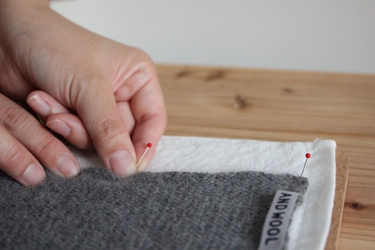 乾いたストールを裏側(ネームタグが付いている側)を上にしてアイロン台の上に置きます。形を整えて端をまち針(頭がプラスチックタイプのものはアイロンの熱で溶けてしまうので、ガラスタイプのものをご使用ください)で複数個所ピン打ちしてください。まち針は、外側に斜めに傾くようにさすとアイロンがかけやすいです。
