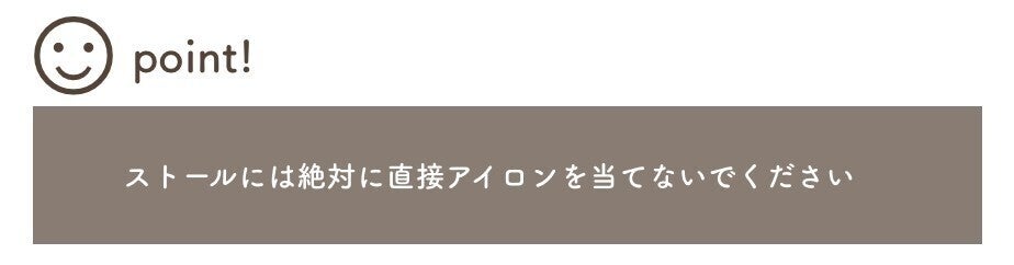 アイロンをかける場合は、直接アイロンを当てずに、少し浮かせてスチームをかけてください。ストールの上に直接アイロンを当てることは、絶対にしないでください。