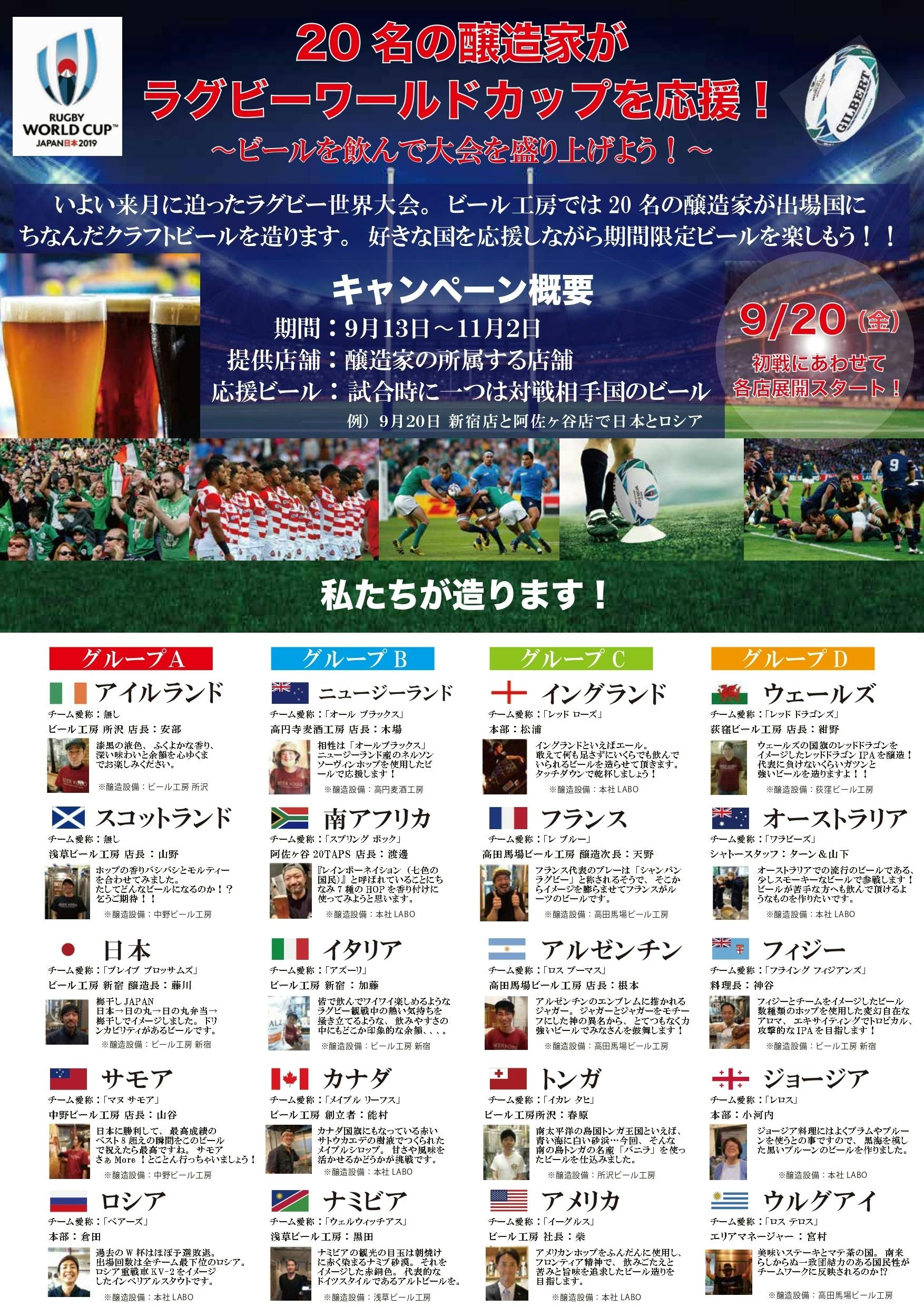 2019/09/13 08:51<ラグビーと言えばビールでしょ!!>今回のワールドカップラグビー出場国では、ビールが大量消費されている「ビール好き大国」ぞろい!そこで、醸造家集団のビール工房が、これまでの知識と経験をフル活用し、出場国にちなんだビールを醸造しちゃいました!これも、「迷ったら造ってみる」という醸造家魂の産物です。いよいよ9/20キックオフ!こうご期待!ちなみに、すでに先行販売中のものもあるので、食べログやツイッターを見逃すな!!<高円寺麦酒工房>醸造家;木場(こばちゃん)担当国;ニュージーランド意気込み;ニュージーランド代表と言えば黒いユニフォームが印象的で相性は「オールブラックス」その強さの象徴と言える黒色を基調とし、強烈な苦味、そしてニュージーランド産のネルソンソーヴィンホップを使用したビールで応援します!食べログリンク;https://tabelog.com/tokyo/A1319/A131904/13120771/ <荻窪ビール工房>醸造家;紺野(こんちゃん)担当国;ウェールズ意気込み;ウェールズの国旗のレッドドラゴンをイメージしたレッドドラゴンIPAを醸造!イギリス産のホップとRedXという麦芽を使った、強いウェールズ代表に負けないくらいガツンと強いビールを造りますよ!!食べログリンク;https://tabelog.com/tokyo/A1319/A131906/13160945/<中野ビール工房>醸造家;山谷(ヤマヤ)担当国;サモア意気込み;協会の財政難で、選手の招集すらままならないサモア代表を応援すべく、サモアをイメージしたビールを造ります。日本と同じグループですが、そんなの関係ありません。日本に勝利して、最高成績のベスト8超えの瞬間をこのビールで祝えたら最高ですね。サモア、さぁMore!とことん行っちゃいましょう!食べログリンク;https://tabelog.com/tokyo/A1319/A131902/13168602/醸造家;山野(くみさん)担当国;スコットランド意気込み;スコットランドのビールと言えば、ブリュードックが真っ先に思い浮かびます。ホップの香りバシバシのPUNK IPAは、私も好きなビールです。一方、伝統的なスコティッシュエールはカラメルのような甘みが感じられる、モルティーなビール。今回はこのふたつを合わせてみます!果たしてどんなビールになるのか!?乞うご期待!!食べログリンク;https://tabelog.com/tokyo/A1319/A131902/13168602/<高田馬場ビール工房>醸造家;天野(あまのっち)担当国;フランス意気込み;フランスと言えばワイン!ですが、実は昔からビールもよく飲まれているんです。フランス代表のプレーは「シャンパンラグビー」と称されるそうで、そこからイメージを膨らませてフランスがルーツのビールで勝利の乾杯をシルブプレです!!頑張れフランス!食べログリンク;https://tabelog.com/tokyo/A1305/A130503/13192265/醸造家;宮村(失念和尚)担当国;ウルグアイ意気込み;サッカーでは強豪国のウルグアイ。ラグビーではどんな活躍を見せてくれるのか?オーストラリアとウェールズを擁する死のプールD!頑張れウルグアイ!美味いステーキとマテ茶の国。南米らしからぬ一致団結力のある国民性がチームワークに反映されるのか⁉南米一の治安の良さはハングリー精神にどう影響する?カンドンベ聴きながら観戦しよう!食べログリンク;https://tabelog.com/tokyo/A1305/A130503/13192265/醸造家;根本(ねもとくん)担当国;アルゼンチン意気込み;アルゼンチンのエンブレ厶に描かれるジャガー。ジャガーとジャガーをモチーフにした神の異名から、とてつもなく力強いビールでみなさんを鼓舞します!食べログリンク;https://tabelog.com/tokyo/A1305/A130503/13192265/ <ビール工房新宿>醸造家;藤川(ふっきー)担当国;日本意気込み;題して「梅干しJAPAN」!「日本→日の丸→日の丸弁当→梅干し」でイメージしました。梅干しを使ったドライでドリンカビリティがあるビールです。ゴクゴク飲んで日本を応援しましょう!!食べログリンク;https://tabelog.com/tokyo/A1304/A130401/13216072/醸造家;神谷(げんちゃん)担当国;フィジー意気込み;題して「フライング-フィジアンズ」。アクロバティックなパスや変幻自在なランニング、そのスタイルはフィジアンマジックと呼ばれファンを魅了します。南太平洋に浮かぶリゾートアイランドで世界有数のリゾート地。。。そんなフィジーとチームをイメージしたビール!数種類のホップを使用した変幻自在なアロマ。エキサイティングでトロピカル、攻撃的なIPAを目指します!食べログリンク;https://tabelog.com/tokyo/A1304/A130401/13216072/醸造家;加藤(かとちゃん)担当国;イタリア意気込み;訪れた事はありませんが、イタリアといえば陽気でハッピーなイメージがあります。老若男女問わず皆で飲んでワイワイ楽しめるような、ラグビー観戦中の熱い気持ちを掻き立てるような、飲みやすさの中にもどこか印象的で余韻のある、そんなピールを目指したいです。醸造経験はまだまだ未熟ですが精一杯頑張りたいと思います。食べログリンク;https://tabelog.com/tokyo/A1304/A130401/13216072/<浅草ビール工房>醸造家;黒田(じょーじさん)担当国;ナミビア意気込み;ナミビアの観光の目玉は朝焼けに赤く染まるナミブ砂漠。それをイメージした赤銅色。ド