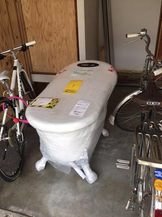 猫足バスタブ届きました!! 只今自宅一階駐車場に置いてあるこのバスタブ、近所でちょっとした噂になっている様子。「何しはんの?」と聞いて下さったご近所さん、完成したら自慢の風呂にご招待して差し上げようかしら!笑。