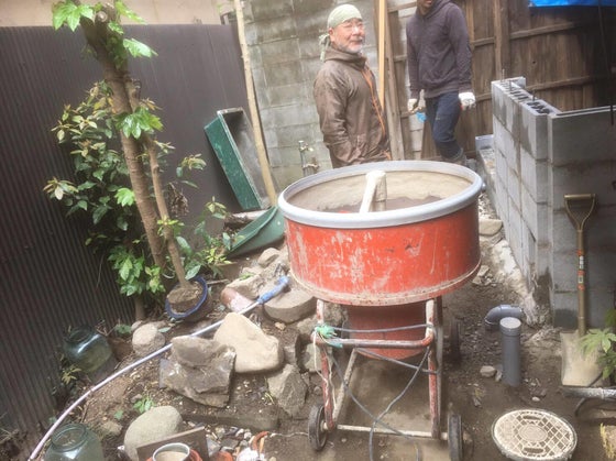 今日もセメントを捏ねては流す現場です。 やっと来ました捏ねる機械!!待ってました捏ねる機械!! 風呂場部分の壁もだいぶんと立ち上がってきましたー。