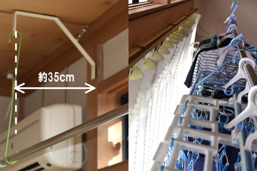 ・物干しざおは壁から約35cm離れて設置できるので、洗濯物がカーテンなどに接触しません。