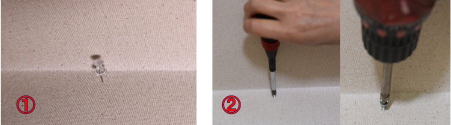 ② フック取り付け位置に、ドライバーや電動ドリルを使って、付属のドリルネジで下穴をあけます。