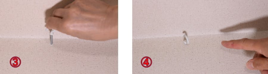 フックは足長タイプを付属しておりますので、「間柱」や「野縁」などの下地にしっかり固定できます。付属の足長ピンを刺して下地があるか確認してから下穴をあけます。