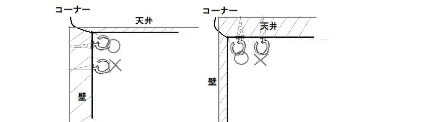 ・取り付けの一番のポイントは、図のように『壁と天井のコーナー部分にできる限りコーナーの隅に足長フックをしっかり取り付けることです。』(壁でも天井でもどちらでもOKです)