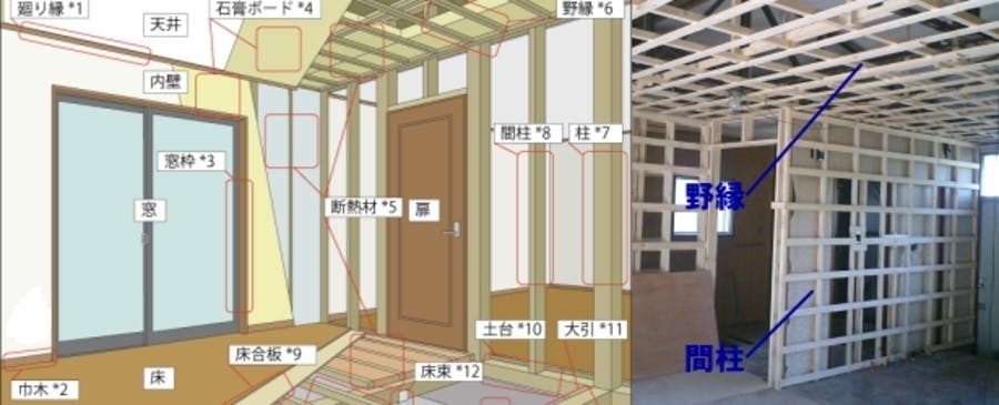 最近の住宅は、壁と天井は石膏ボードが使用されその上にクロスが貼られていることがほとんどです。石膏ボードは、壁は「間柱」に、天井は「野縁」などの下地に釘などで張り付けてあります。