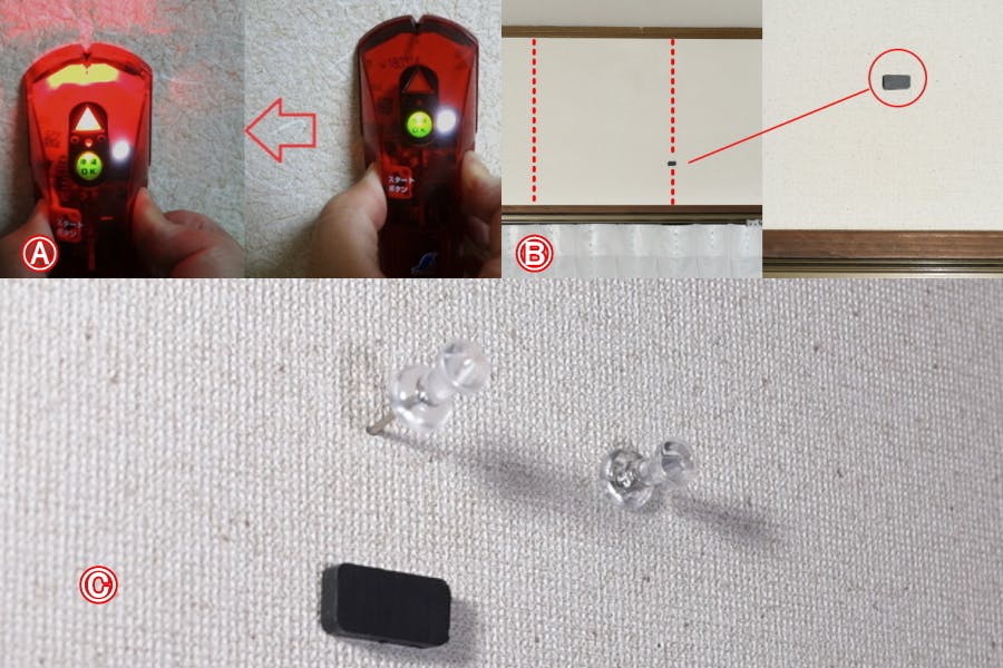 ホームセンターなどで売っている「下地センサー(1,000 ~1,500円)」を使うのもいいでしょう( 図 Ⓐ )。もっとアナログな方法では、磁石を使って石膏ボードを固定している釘やネジを探す方法もあります( 図 Ⓑ )。壁や天井に磁石が張り付いた箇所を見つけて、その延長上が間柱や野縁がある位置です。