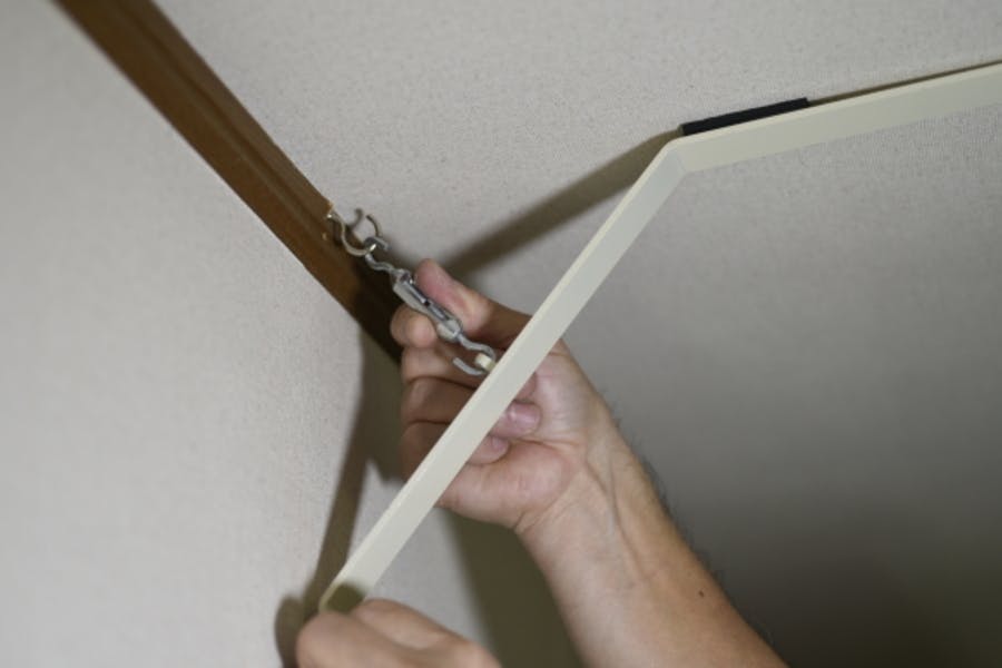 ・取り付けのポイントは、壁と天井のコーナー部分にフックをしっかり固定することです。