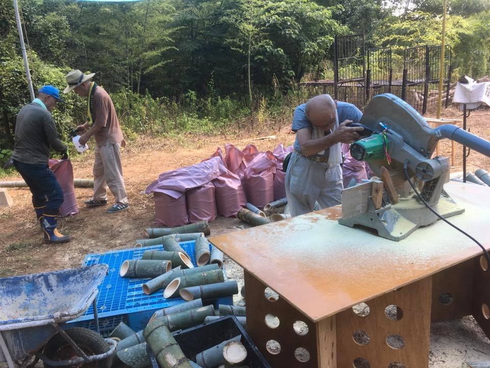 2019/09/18 16:18【 作成部会進捗状況報告 9/15 】日曜で今までで最高の応援団が集まりましたふた山あった竹材は見事に全部標準品の竹灯籠になりましただんだんと体育館の床が灯籠で埋め尽くされていきます全員汗びっしょりになりながら、でもたくさんの休憩と笑顔で予定以上の作成ができました竹材保管場所を3箇所に増やし、丸ノコはフル回転、また三本括りのペケ台も2台に拡張しました人海戦術で出来上がった灯籠セットがどんどんトン袋に詰められていつでも移設可能になりました創作灯籠作成エリアを新設し、本格的に飾りの穿孔を施した長い灯籠作りも並行して進んでいます もっと見る