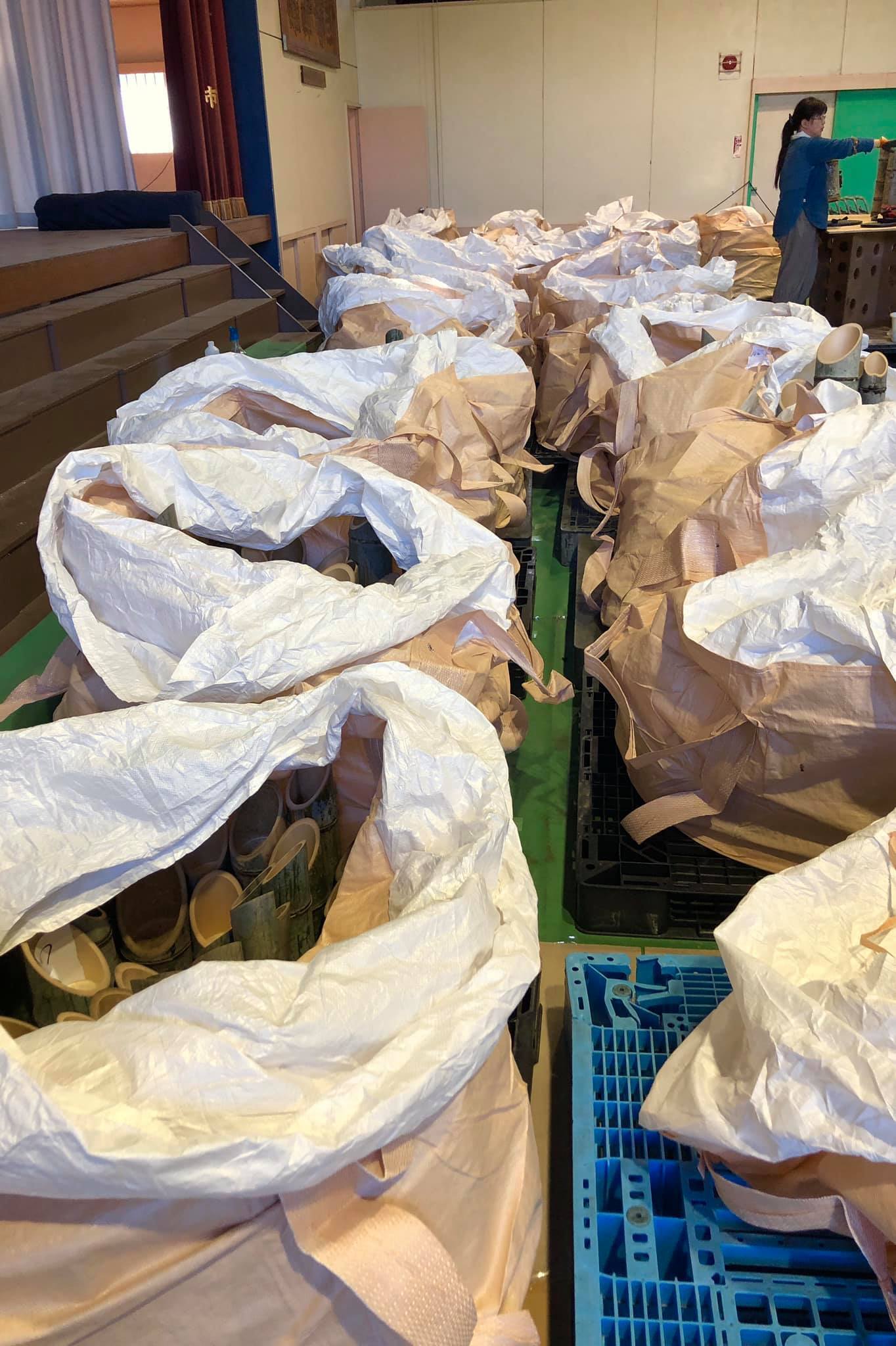 2019/09/18 16:16【 作成部会進捗状況報告 9/14 】9月1日に北小倉小学校をお借りしてから14日を経過しました。日程的にはざっくり25%を費消したわけです。1万本の目標に対し現時点で切った燈籠総数は2616本、内訳は、3本テープ括りを終えパレットのトン袋内に格納し、カビ防止のオスバン噴霧まで完了したのが1284本、完成品になっていて括り待ちが1332本です。他に3本括り、別にトン袋まで入れもう少し空きがあるオスバン噴霧待ちが15セット程度ありますから2690本まで漕ぎ着けました。進捗率27%と言ったところです。準備に6日程度を要しましたから実質8日でこれだけできました。ひとえに切り方に専念くださった臼井さん、植村さんのご尽力に感謝します。また、地道に三本を束ね向きを調整しながらゴムバンドで固定したうえでずれないようにテーピングするという気が遠くなる仕事を黙々と続けてくださるたくさんのボランティアの皆様に脱帽、最敬礼です。安全面を最重要視し、竹材のユニットを2巻ずつ入れてもバラけさせず、流れるように崩れることなく複数箇所へ分散荷降ろし可能になりましたから、あとは倍以上のスピードで切れるでしょう。プラパレットが不足気味です。100程度追加したいところです。トン袋は追加発注目処ですが、無償で借りるところも模索。この課題が解決し、ボランティアの皆さんのご協力があるなら早ければ9月中に1万本の大台も夢ではないでしょう。万一を考え4台体制にした丸のこの安定性(刃が折損したりモーターが焼付いたりの故障懸念)と切り方専門のオペレーター常駐が次の課題です。また、飾り灯籠の仕様に合わせて材料を吟味し用途別に選別して整理整頓の集積中。鋸屑も毎日きれいに清掃して分別回収し、土壌改良や乳酸発酵させ再利用の道を検討しているメンバー用にストックしています もっと見る