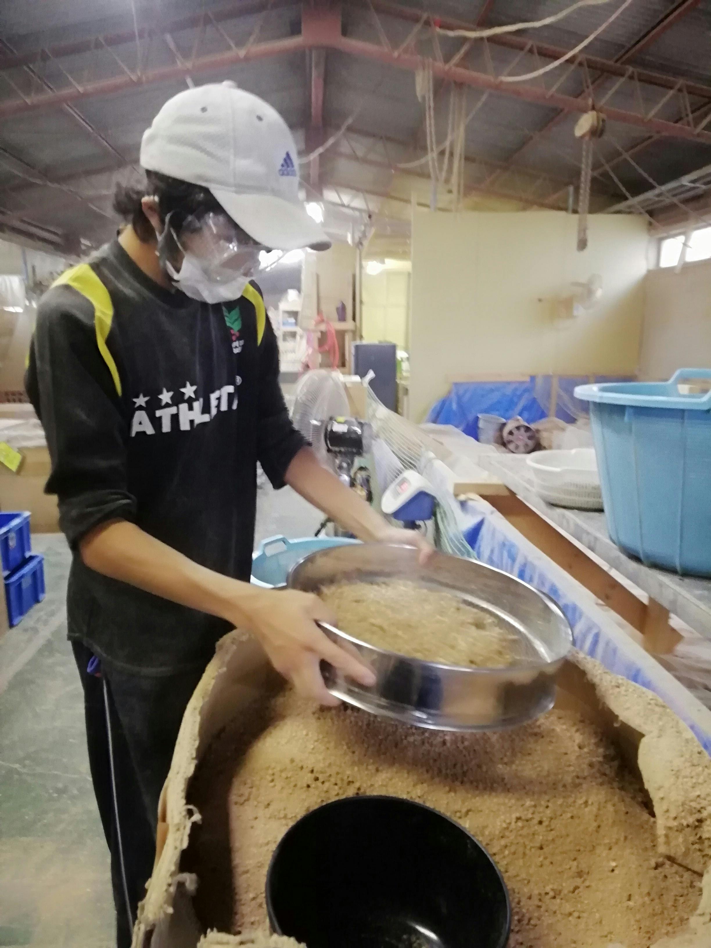 新工場で直ぐに作業ができるように、日々「命の猫砂」の製作研修に参加しています。