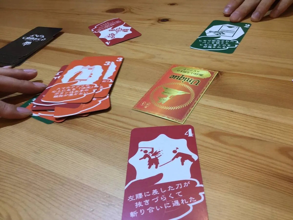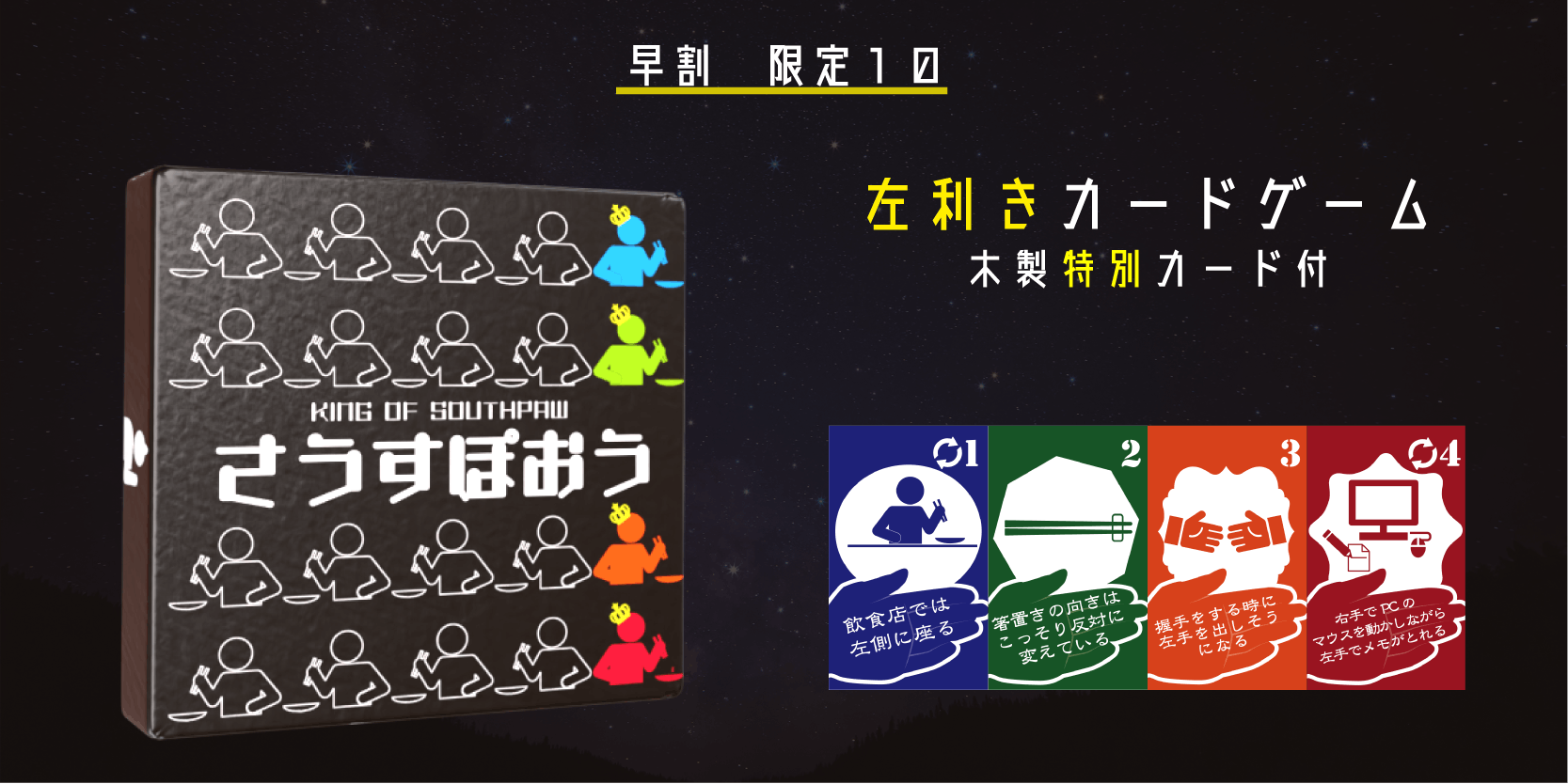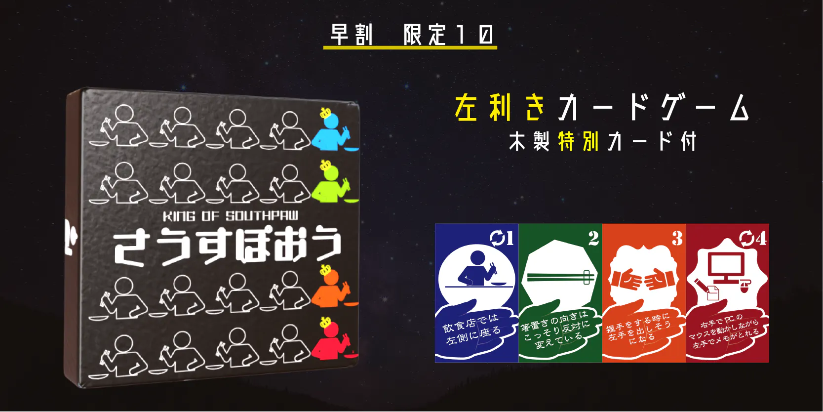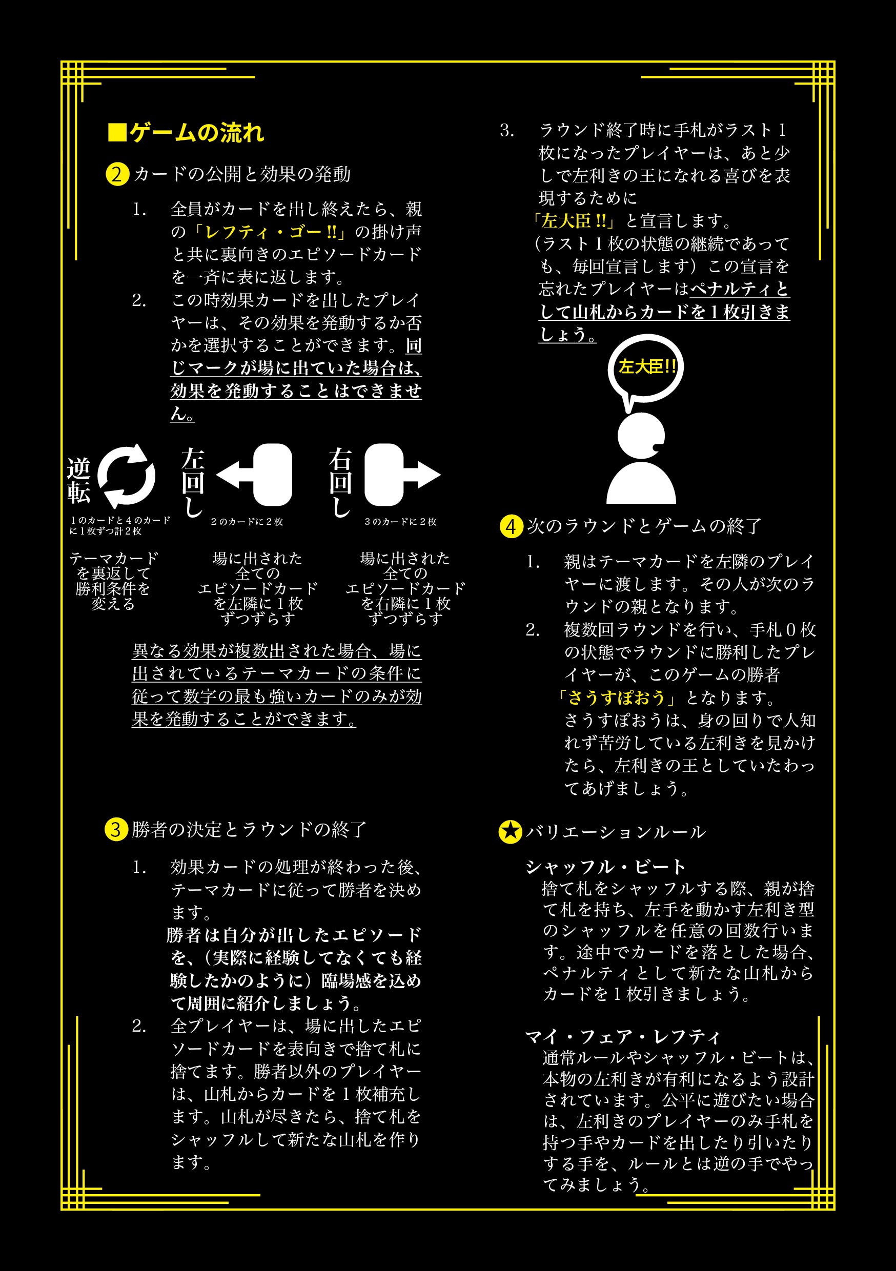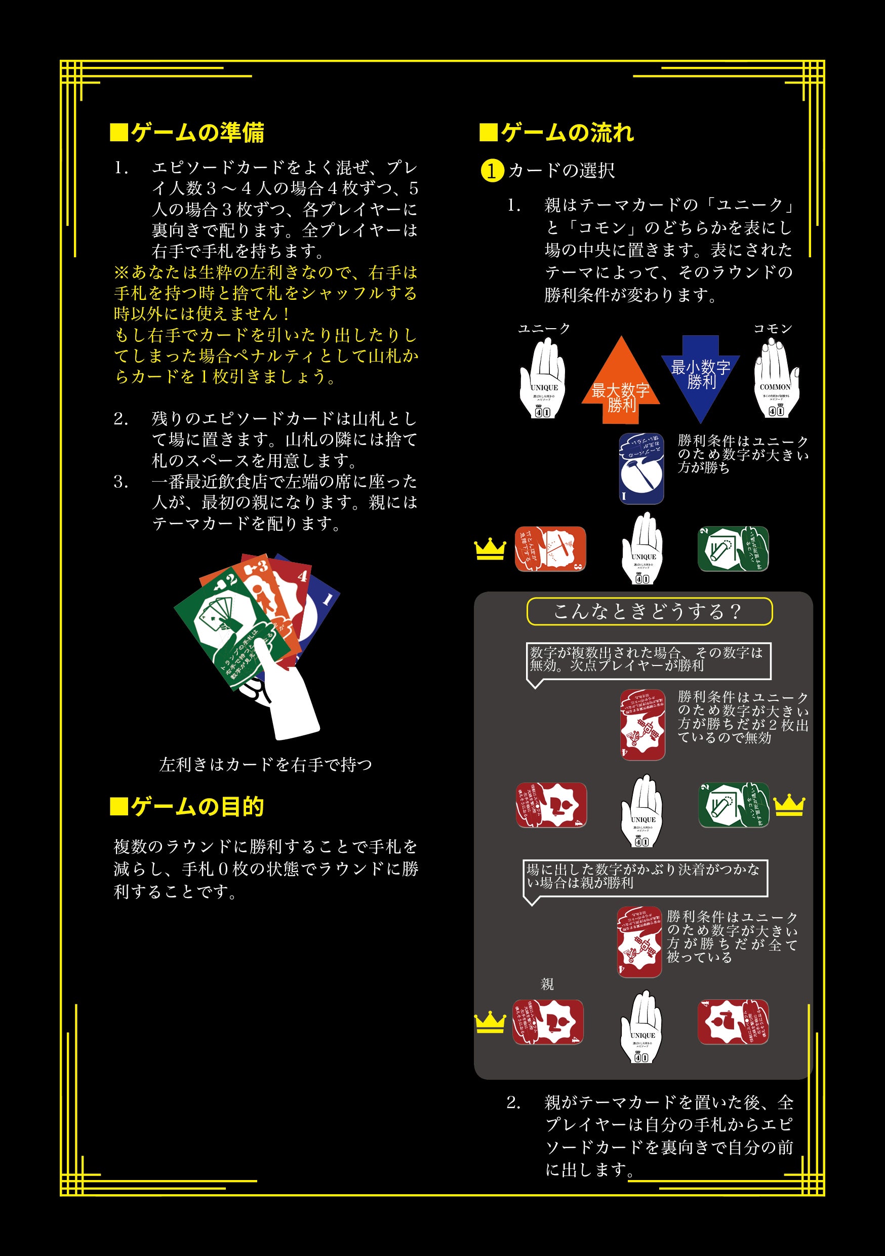 そして何より気を付けなればならないのは、このゲームをプレイしている最中、あなたは生粋の左利きとしてふるまわなければならないということです。もしゲーム中に右手でカードを出したり引いたりしてしまった場合、ペナルティとしてカードを1枚手札に追加することになります!