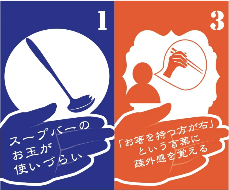 左利きは、不便であっても仕方のないことだからとスープバーのおたまを慣れない右手で持ち、疎外感を覚えたとしても「お箸を持つ方が右」という説明を受け入れるしかないのです。