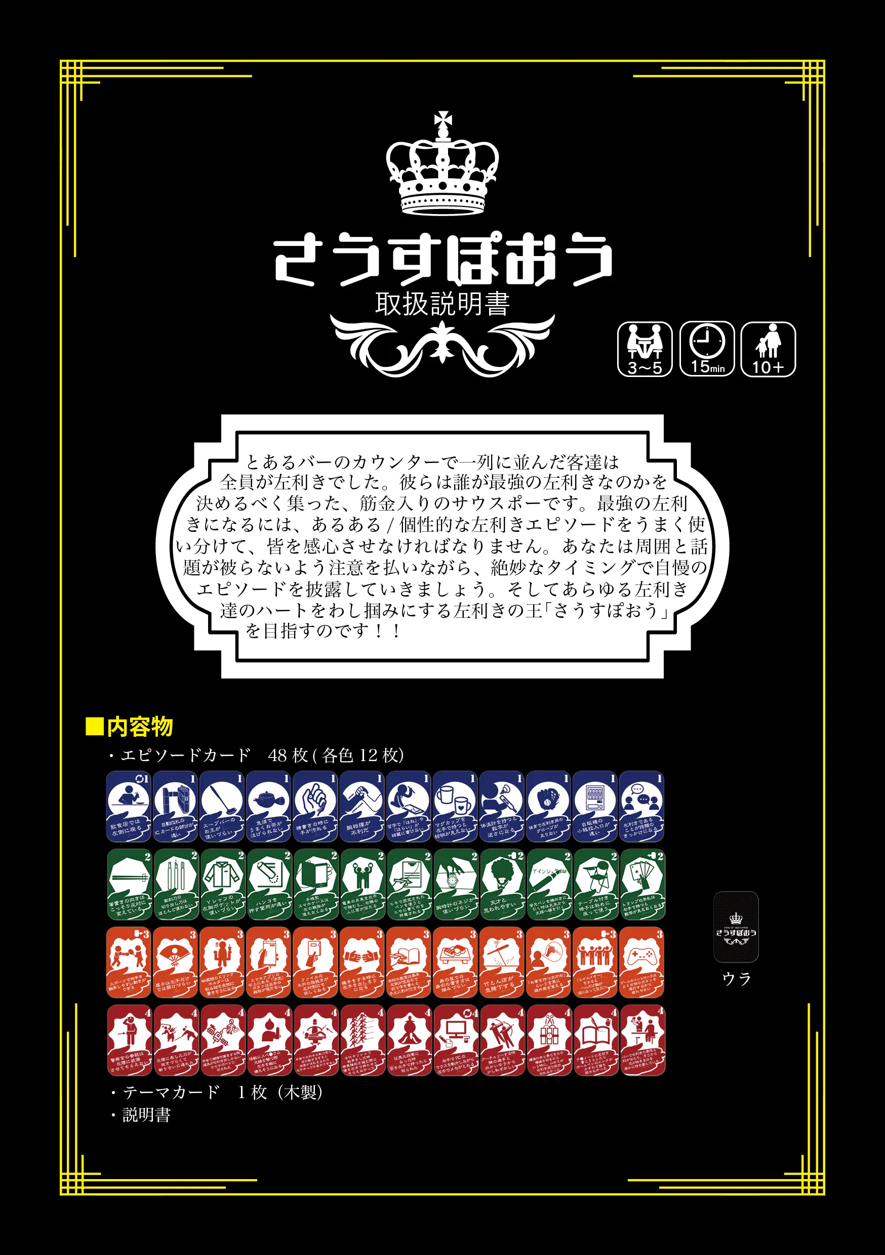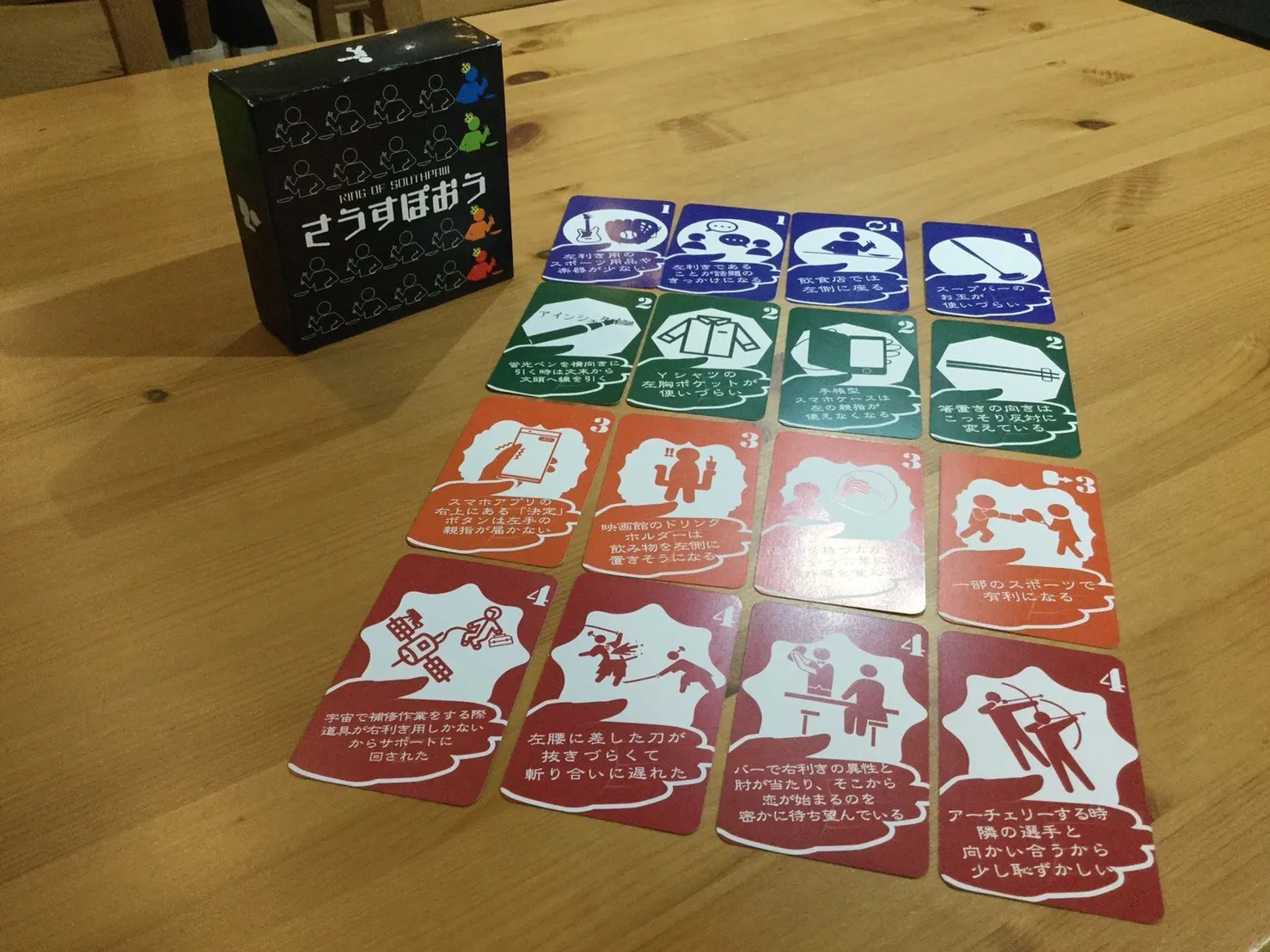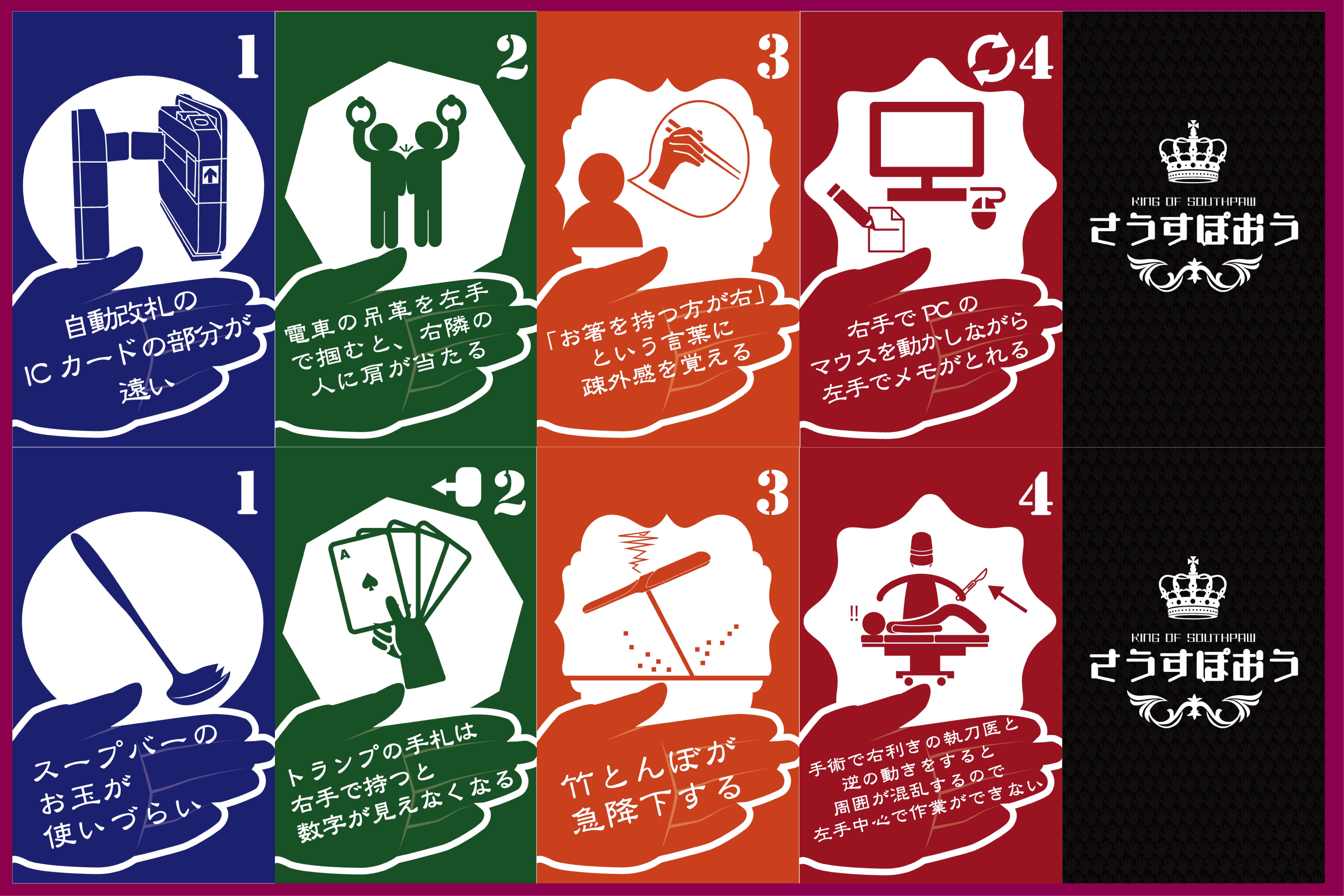 「さうすぽおう」の魅力は、左利きを徹底的にフィーチャーしていることにあります。なんと48種類もの左利きエピソードをまんべんなく集めてカード化しているのです!