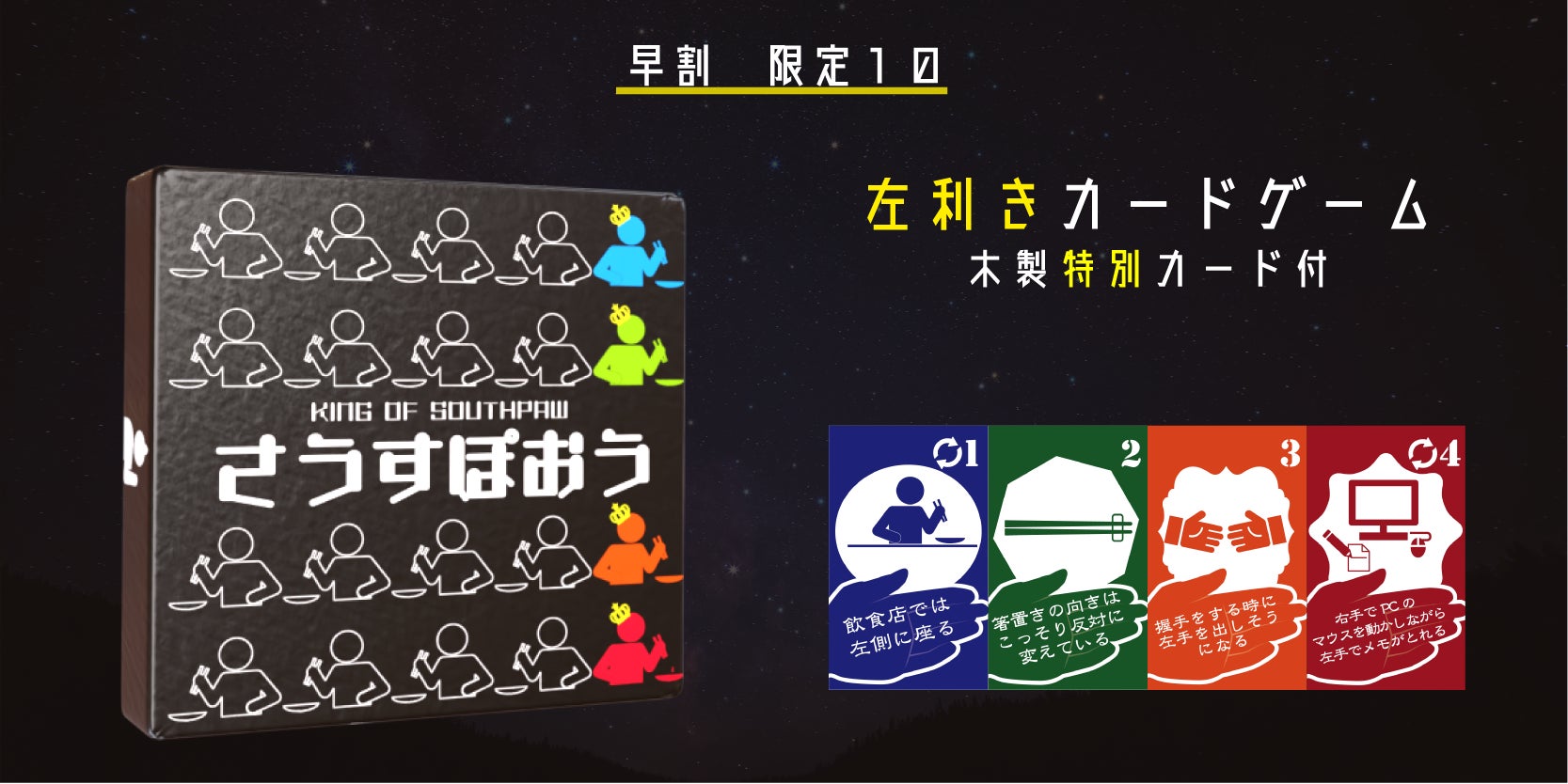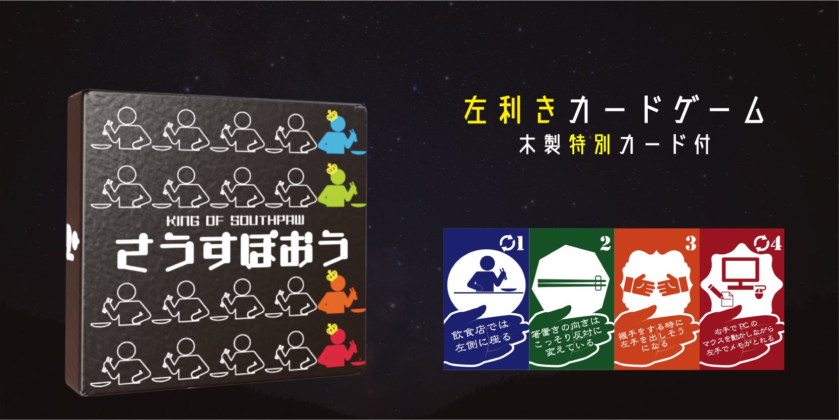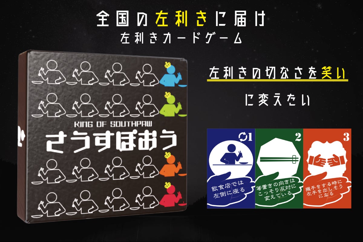 ゲームマーケットではビッグサイトに足を運んでいただいた方にしかさうすぽおうをお渡しすることができず、遠方の方から「買いたかった」と嘆かれる声が多数届きました。その無念を晴らすべく、今回のクラウドファンディングを通じて、より多くの左利きの切なさを笑いに変える事ができればと思っています。そのためにたくさんの方に興味を持っていただき、ご支援いただけると幸いです!!