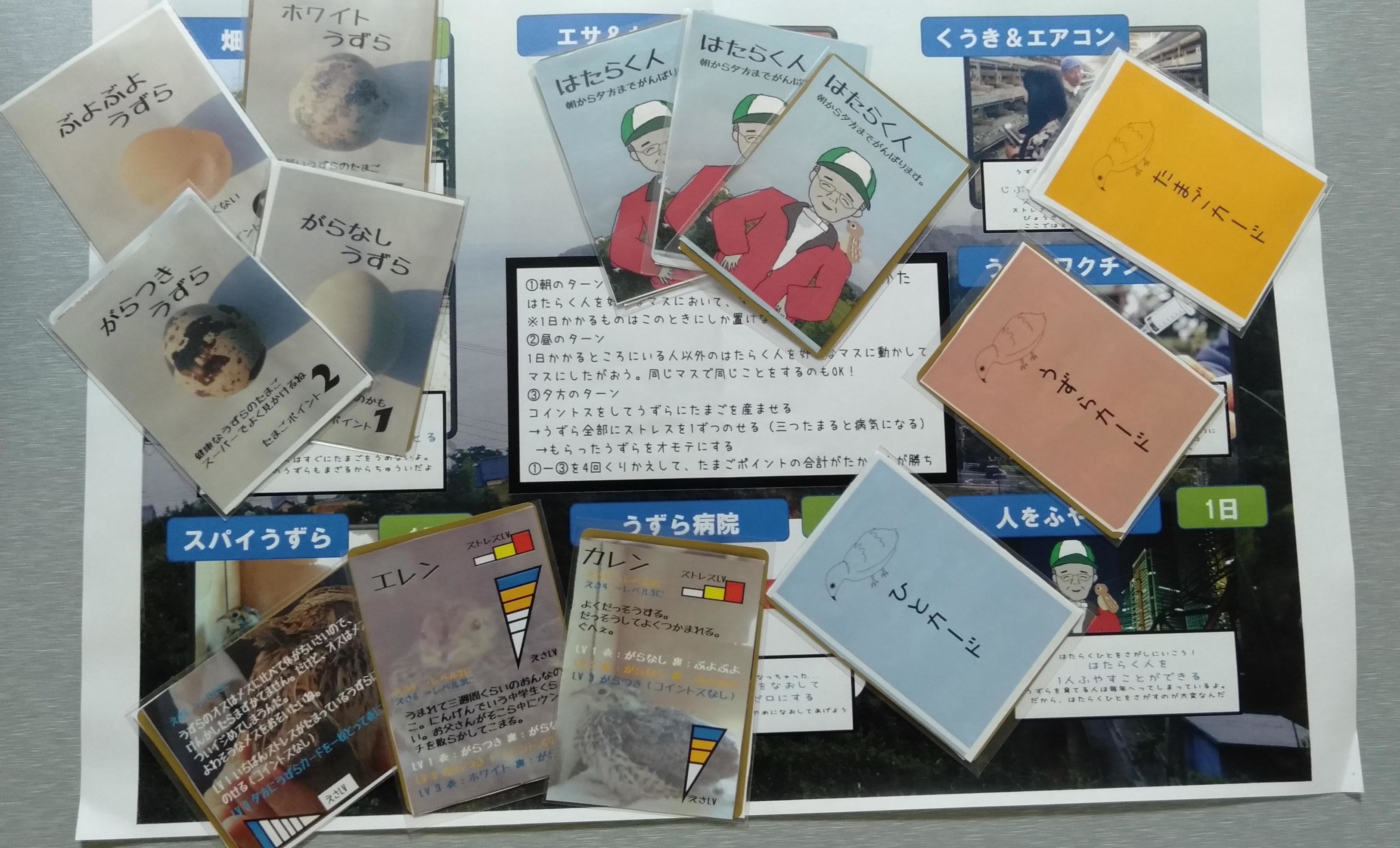 このカードゲームはウズラを育てて、良い卵をたくさんつくる過程を通して、普段私達がスーパーで目にするウズラの卵がどのように生まれてくるのかについて考えるゲームです。