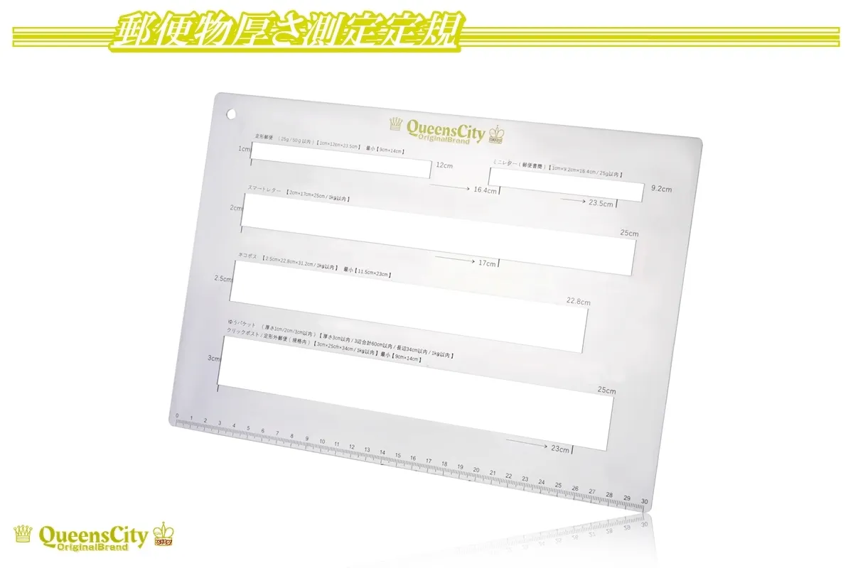 5.様々な配送パターンに適応「定形郵便」「ミニレター」「スマートレター」「ネコポス」「ゆうパケット」「クリックポスト」その他に関しても定規の下方に30㎝の物差しを付けておりますので自由に測定することができます