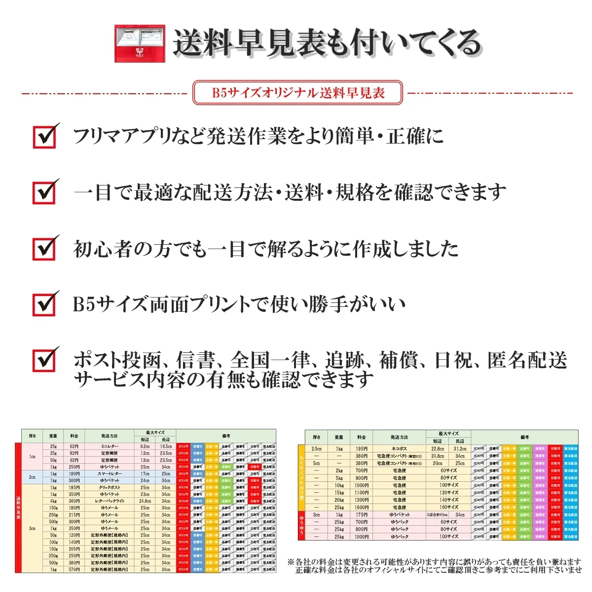 ・またそれぞれの配送方法には「最小サイズ」というものがありこれを下回っても規格外で返送されてきます、非常に見落としがちなので参考になるかと思います・送料早見表もおまけで付いてくる