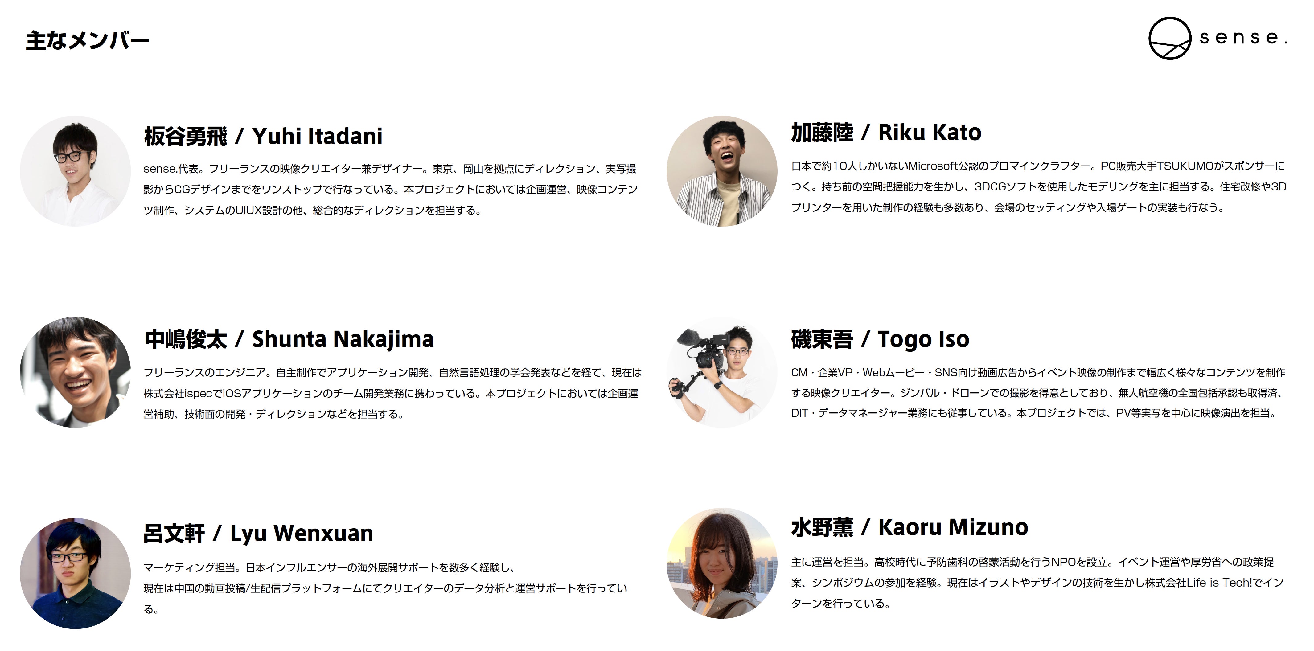 私たち「sense.」は慶應義塾大学 湘南藤沢キャンパス(通称SFC)を拠点に、学生でありながら各々の分野でプロとして働くメンバーを融合させ、次世代のデジタルクリエイティブ表現を創造することを目指して活動しています。