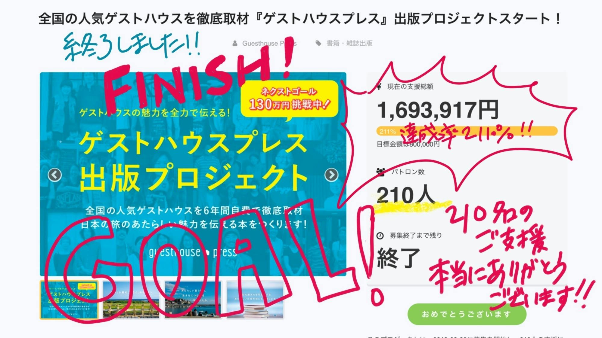 2019/09/30 14:57ゲストハウスプレス出版プロジェクトクラウドファンディングをご支援くださったパトロンのみなさま こんにちは!ゲストハウスプレス編集長ニシムラです。 昨日、ご支援くださったクラウドファンディングが終了しました。 9月半ばに当初の目標は達成、その後ネクストゴールとして設定した130万円も終了2日前に到達し、最後は210人のパトロンさまのご支援により1,693,917円の資金を集めることができました!! プロジェクトへの金銭的ご支援も大変感謝しておりますが、さらにたくさんのハートのこもった応援メッセージもいただき、プロジェクトメンバー一同感激しています。本当にありがとうございました!書籍の完成は12月初旬、みなさまに書籍等のリターンをお届けできるのは今年年内いっぱいかかる可能性もありますが、必ずお届けしますので気長にお待ちいただけると幸いです。 これから書籍完成、リターンのお届けの進捗も含め、時々活動報告もお届けするので、そちらもぜひ楽しみにしていていください。 みなさまのご協力、あらためて感謝いたします。ありがとうございました!ゲストハウスプレス出版プロジェクト チームメンバー一同&編集長 西村祐子 もっと見る