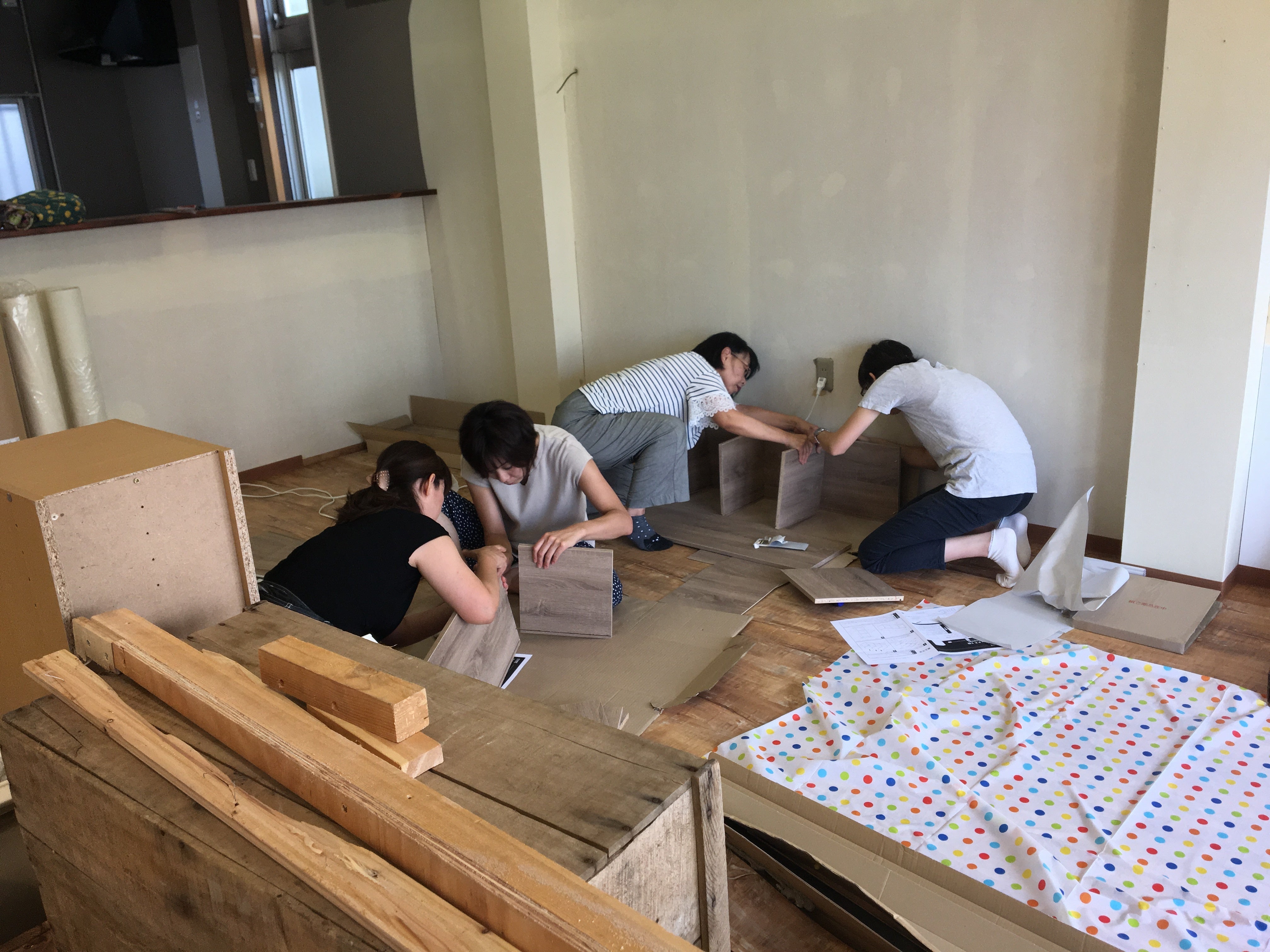 有志の皆様にお手伝いいただき、什器の組み立てをしました。