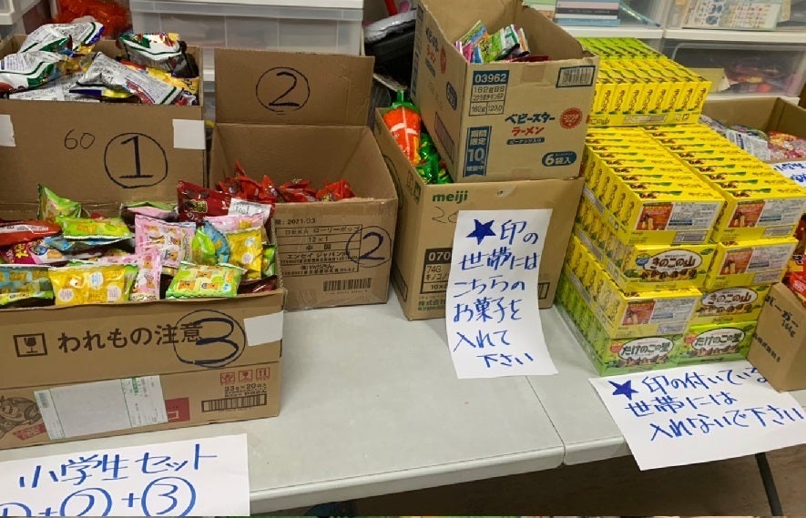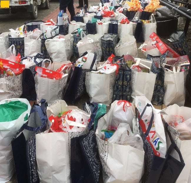 青い袋に願い事のプレゼントが、白い袋に食料品、1世帯に2袋届けます。