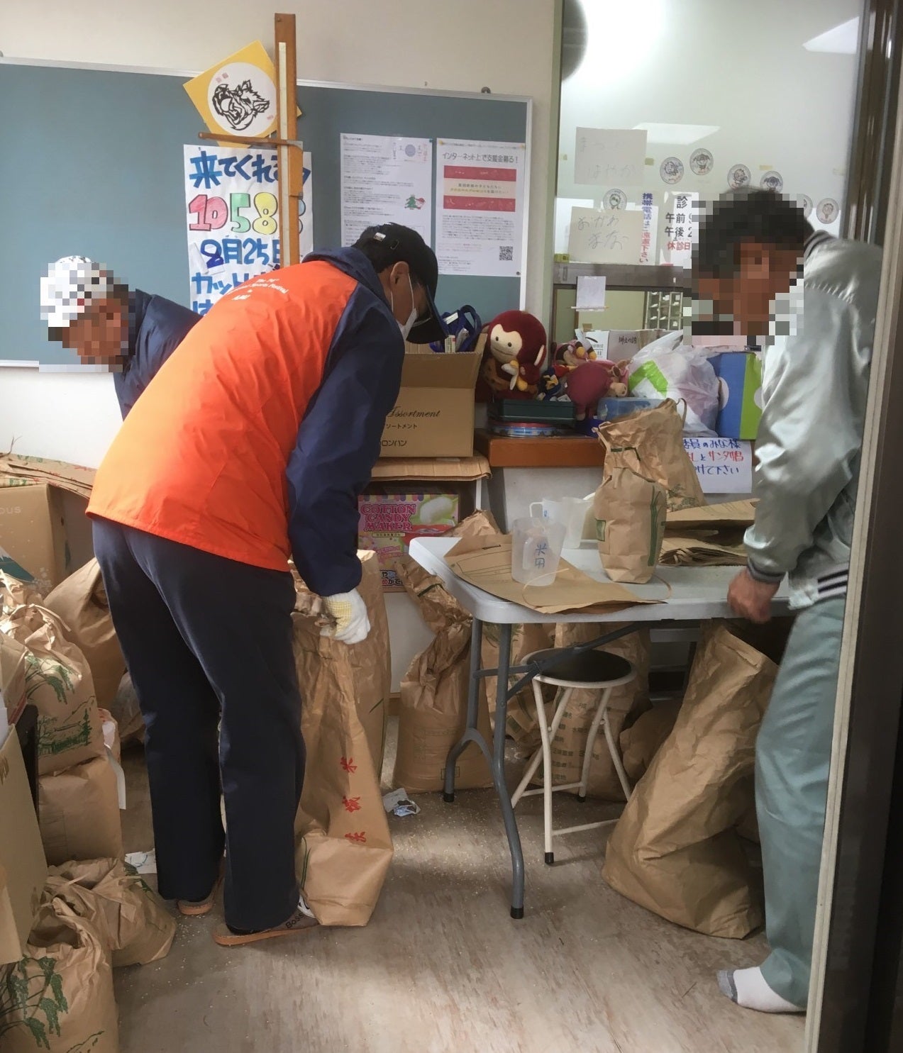 1トンのお米を5kgに量り、袋詰めしています。 延々と続くので、とっても腰が痛くなる作業です。