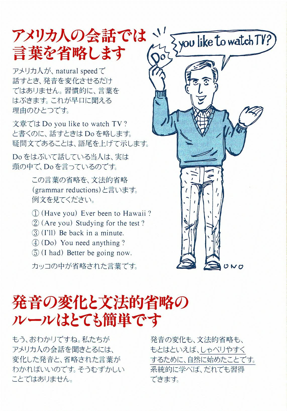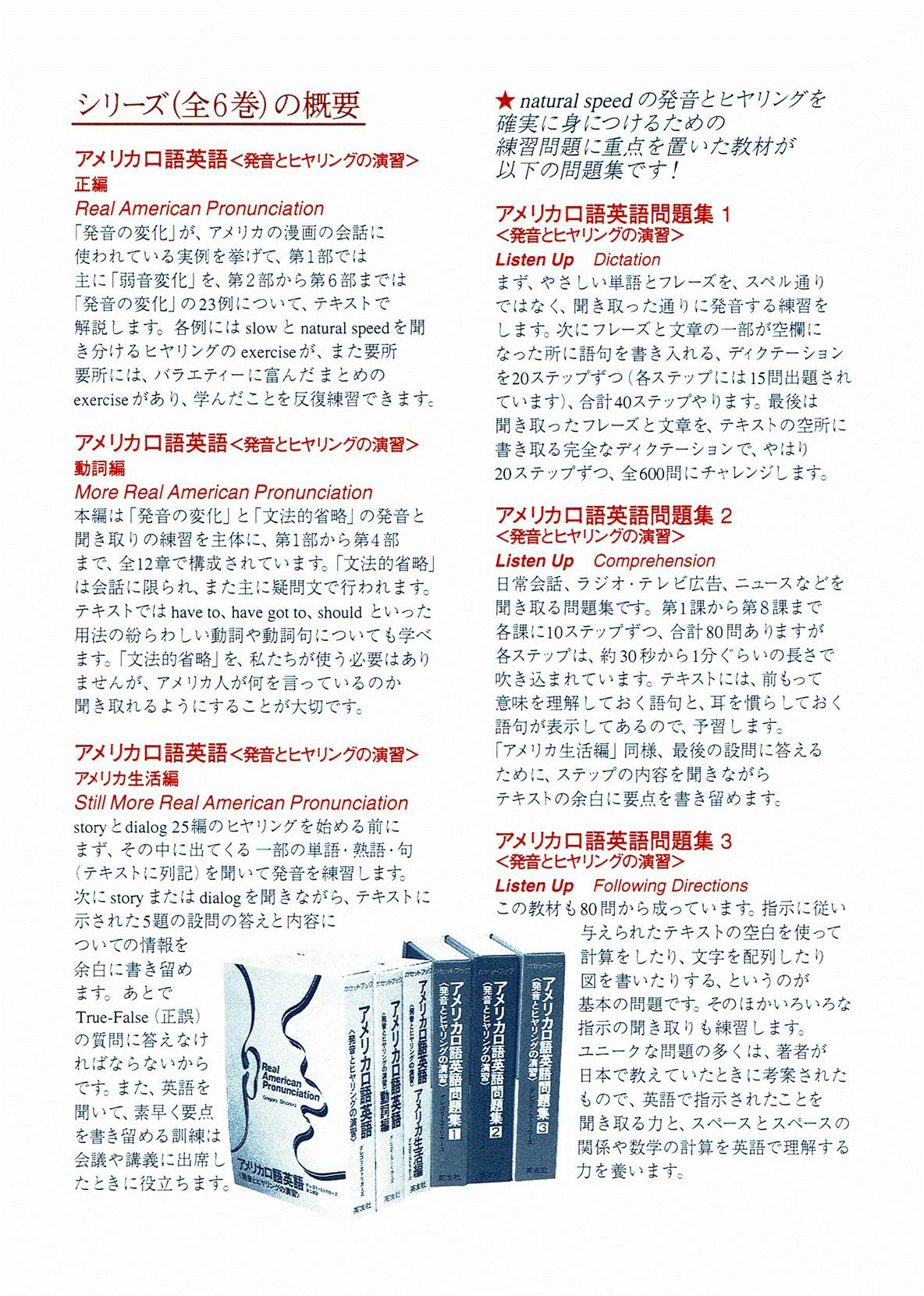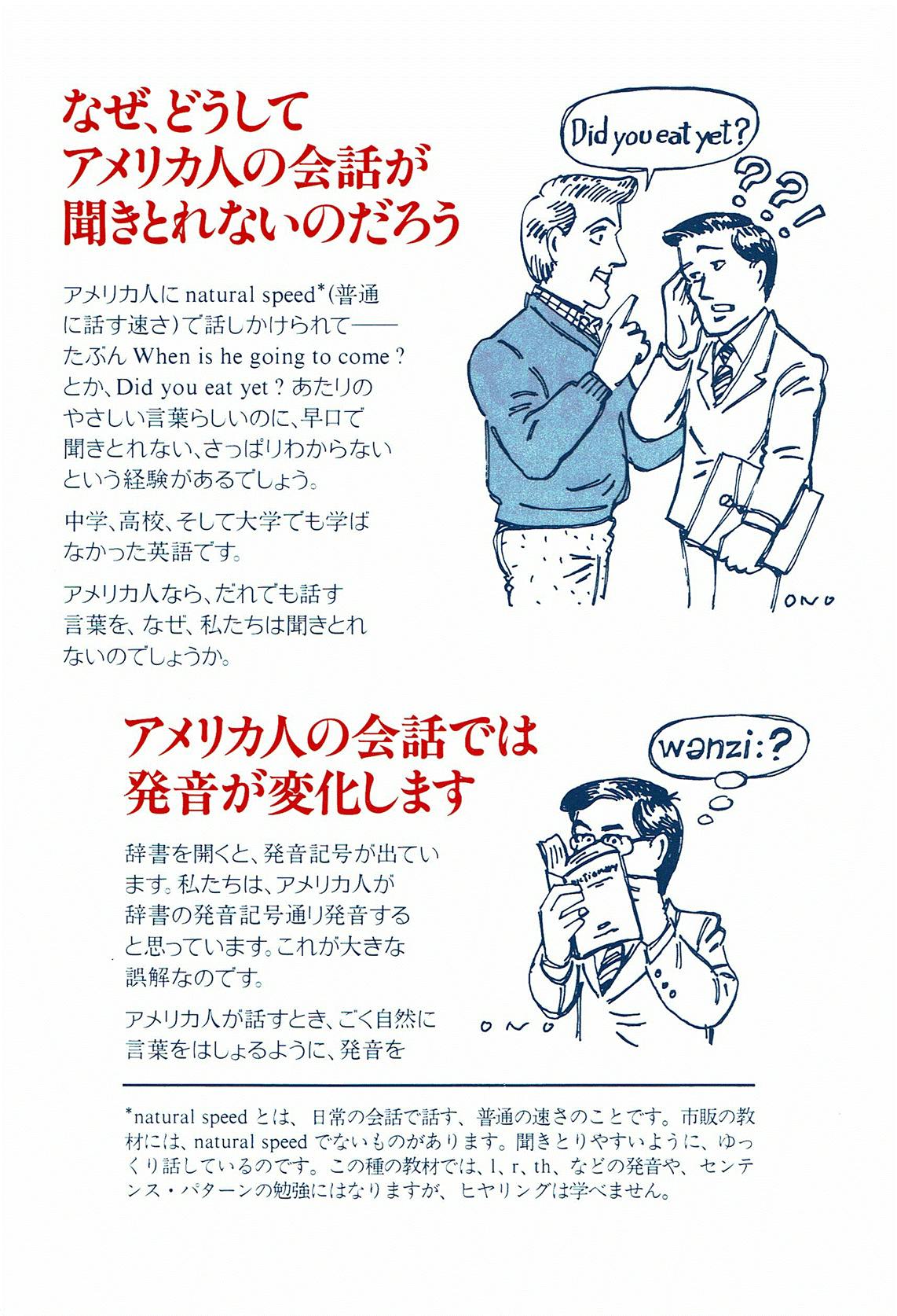 Listening と併用するのは、同じく上記の『書く英語・基礎編』(How to Write English Vol.1)、『書く英語・実用編』(How to Write English Vol.2)です。重要なことは、両書籍には十分な練習問題と解答が提供されていることです。『アメリカ口語英語(発音とヒヤリングの演習〉』にも十分なQ and A の項目が設けてありますから、これらの教材を利用することで、日常必要な英語を書く・聞く基本的な能力を習得でき、また自習用として活用を奨励します。各教材は、ELS 会員各自で購入していただきます。ELS の会費は登録料を:3000円 (消費税込み)、授業料:1時間3500円 (消費税込み) を予定しています。