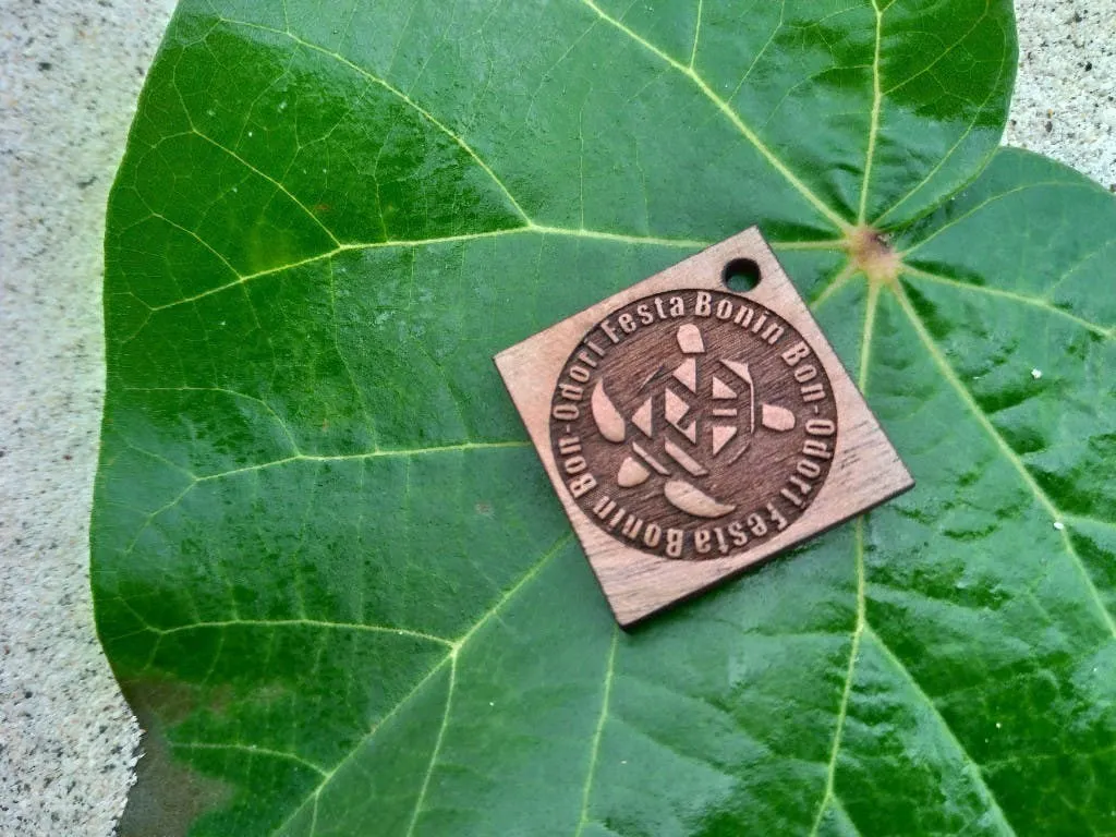 サイズは約3㎝×3㎝、レーザー加工で焼き付けられたBonin Bon-Odori Festaのイメージロゴ「盆亀」が浮かび上がります。