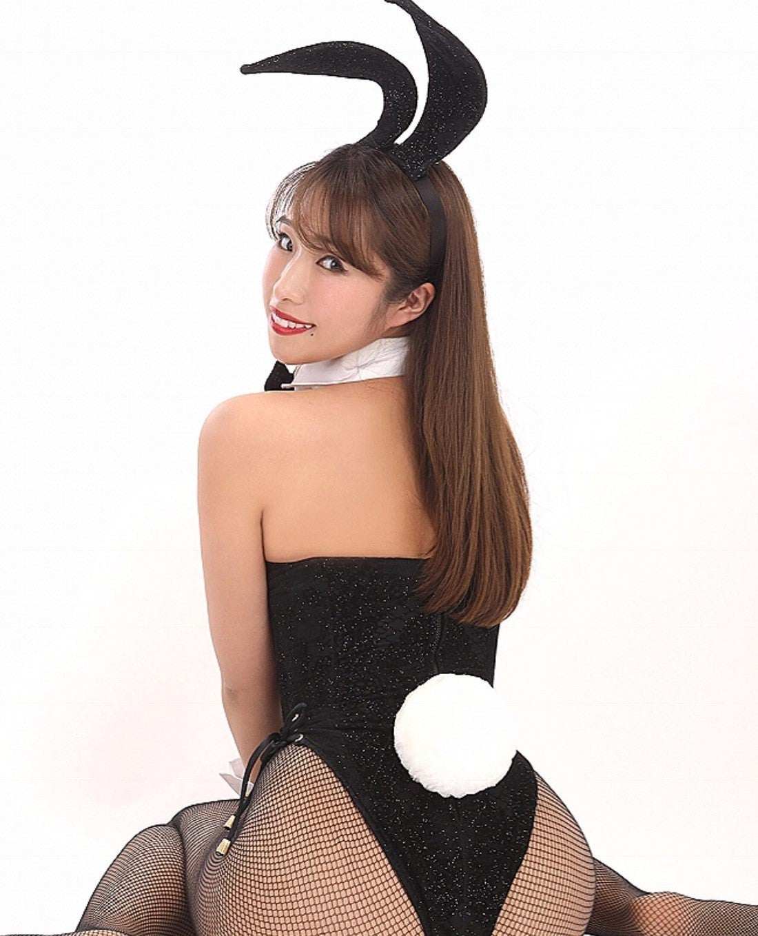 耳、蝶ネクタイ、カフス、尻尾、網タイツにハイヒールという
